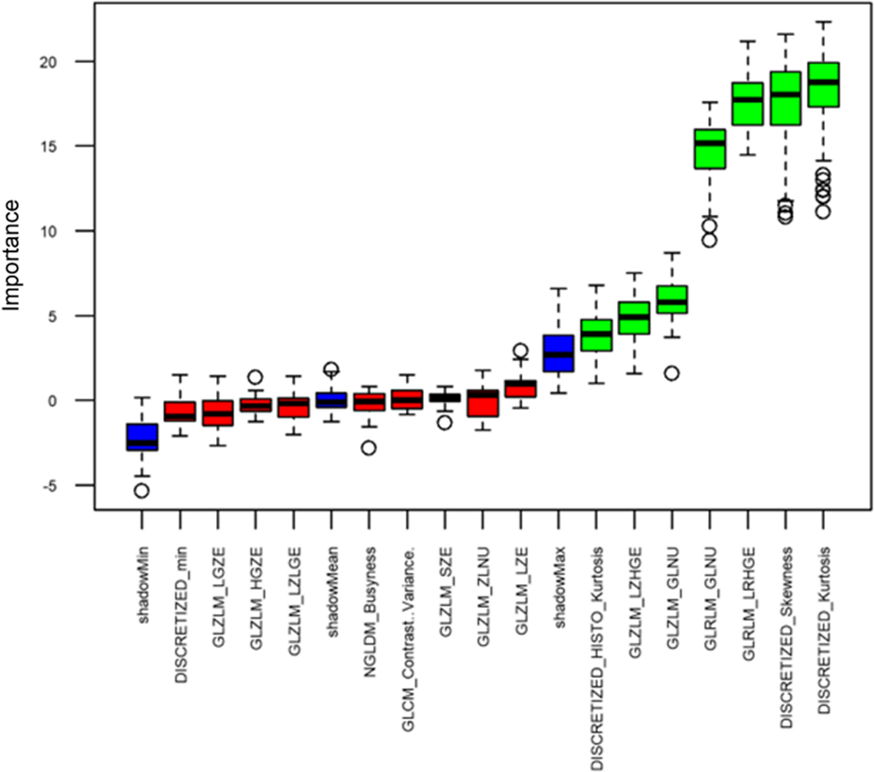 Feature selection with Boruta algorithm. Blue boxes correspond to shadow attributes, green color indicates important attributes, and red boxes indicate attributes that are deemed unimportant