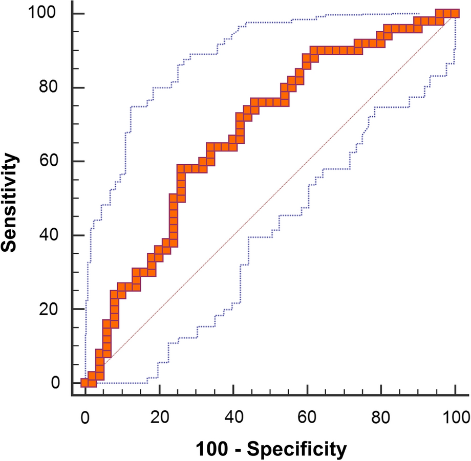 Receiver operating curve for GLRLM_GLNU derived from 16 GL discretization for the prediction of decreased MFR in patients with visually normal MPI