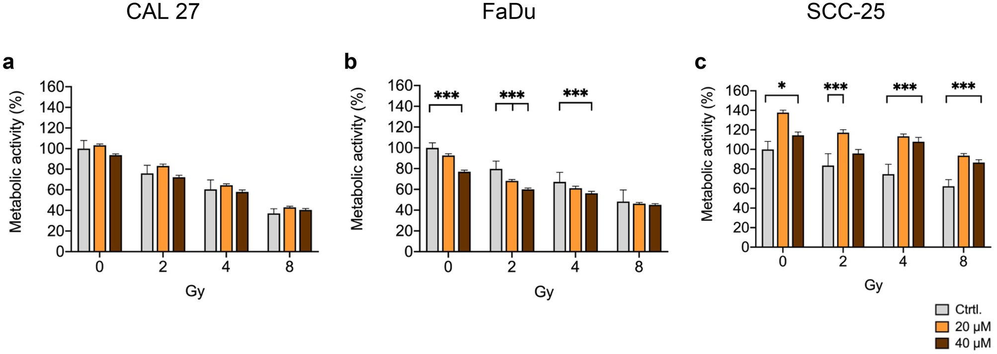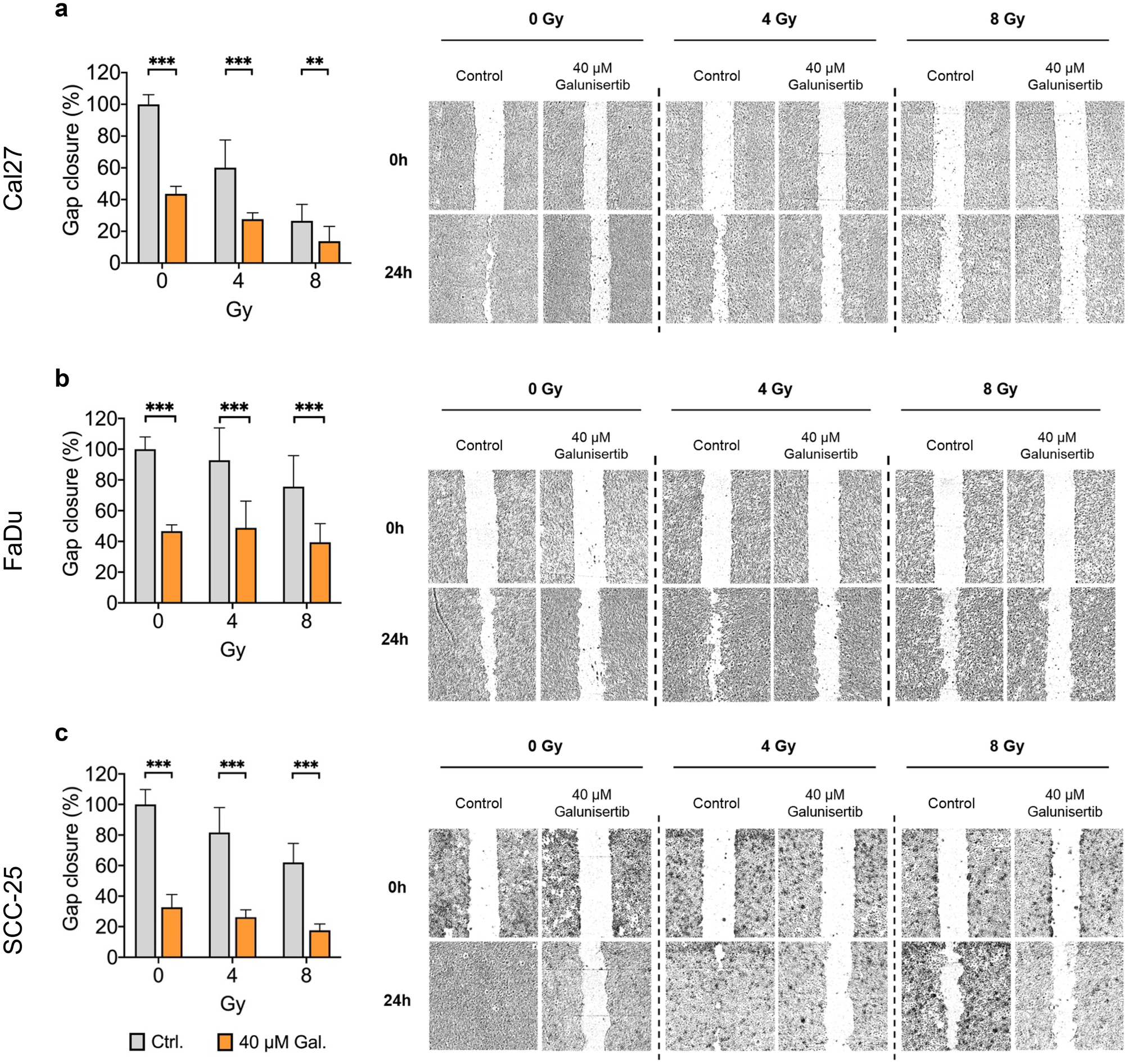 31]. An inhibition of this mechanism might therefore explain more efficient radiation-induced DNA damage. In the other two tested cell lines, drug response was not as distinct. In FaDu, we could observe a reduction in metabolic activity and cell migration after galunisertib treatment. In CAL27, an inhibitory effect could be observed for cell migration after galunisertib treatment with an additive effect with radiation. Consistent with our results, galunisertib showed inhibitory effects on cell migration in primary cholangiocarcinoma cells [