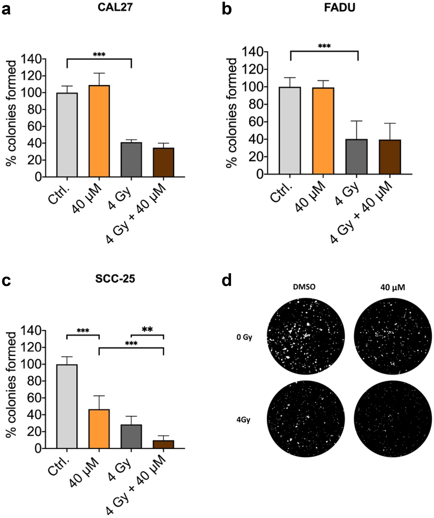 2 (SCC-25) cells were plated in 6‐well plates and incubated for 24 h. Cells were then treated with galunisertib and/or irradiated with 4 Gy. After 72 h, the drug‐containing medium was replaced by a drug-free medium. After further 10 days, cells were washed with phosphate-buffered saline and photographed using a microplate reader (Tecan Spark ®, Tecan Group Ltd., Maennedorf, Switzerland). Colonies consisting of more than 50 cells were regarded as survivors and automatically counted using ImageJ. The surviving fractions were normalized to untreated controls.