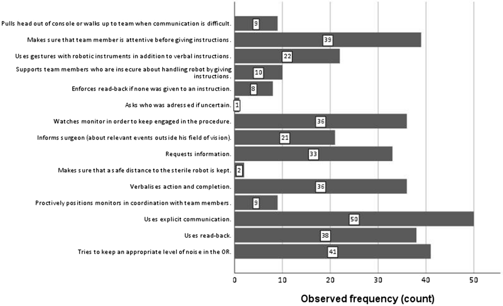 As shown in Fig. 2, some behaviours such as ‘uses explicit communication’ and ‘tries to keep an appropriate level of noise in the OR’ were very prevalent (96.2% and 78.9%, respectively). Others such as ‘makes sure that a safe distance to the sterile robot is kept’ (3.8%), ‘proactively positions monitors in coordination with team members’ (17.3%) or ‘asks who was addressed if uncertain’ (1.9%) were rarely observed. The online supplement (Table A5) lists examples for each behaviour.