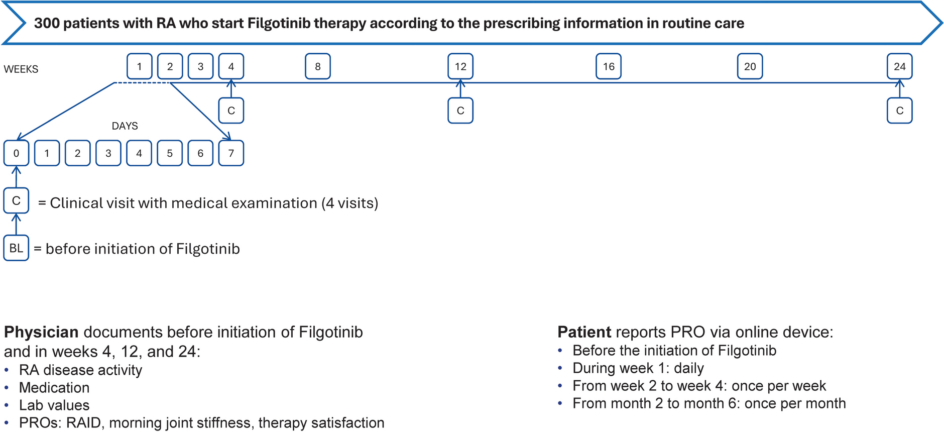 The overall study flow is illustrated in Fig. 1, with study procedures and assessments detailed in Table 3. Clinical assessments are scheduled at baseline and at weeks 4, 12 and 24, while patient-reported outcomes (PROs) are more frequently collected electronically (daily from day 0 to day 7; weekly through week 4; and monthly through week 24) to capture early and longitudinal treatment effects.