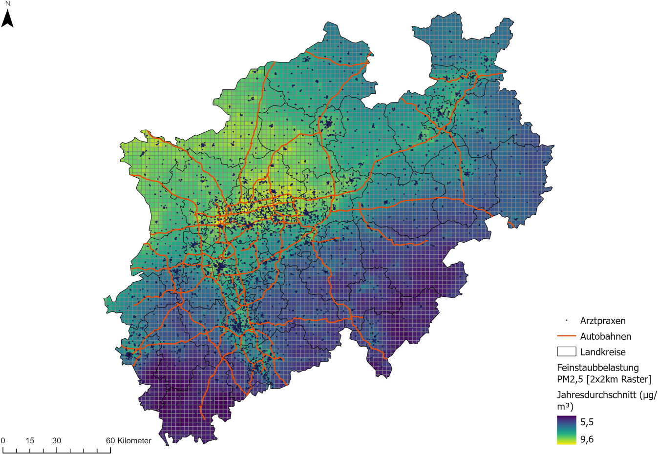 Rasterdaten hingegen stellen Flächen auf einem Gitter dar. Sie bestehen aus gleich großen Bildpunkten (Pixeln) und eignen sich insbesondere zur Darstellung von Bevölkerungsdichten oder Umweltinformationen wie Feinstaubbelastungen, was im Kontext umweltbedingter Gesundheitsrisiken relevant sein kann. Sie erleichtern zudem Kombinationen mit anderen Daten (z. B. Schadstoffbelastung und körperliche Aktivität), die in übergreifenden Public-Health-Studien Anwendung finden [15]. Die verschiedenen Datentypen können auch in einer Darstellung kombiniert Anwendung finden. Ein Beispiel ist in Abb. 1 zu finden. Hier werden administrative Daten (Landkreise) als Polygondaten und Autobahnverläufe als Liniendaten des Bundesamts für Kartographie und Geodäsie, Daten auf Basis der optimalen Interpolation zur Feinstaubbelastung des Umweltbundesamtes als Rasterdaten sowie Daten zu Standorten von Arztpraxen als Punktdaten aus OpenStreetMap in einer Karte dargestellt.