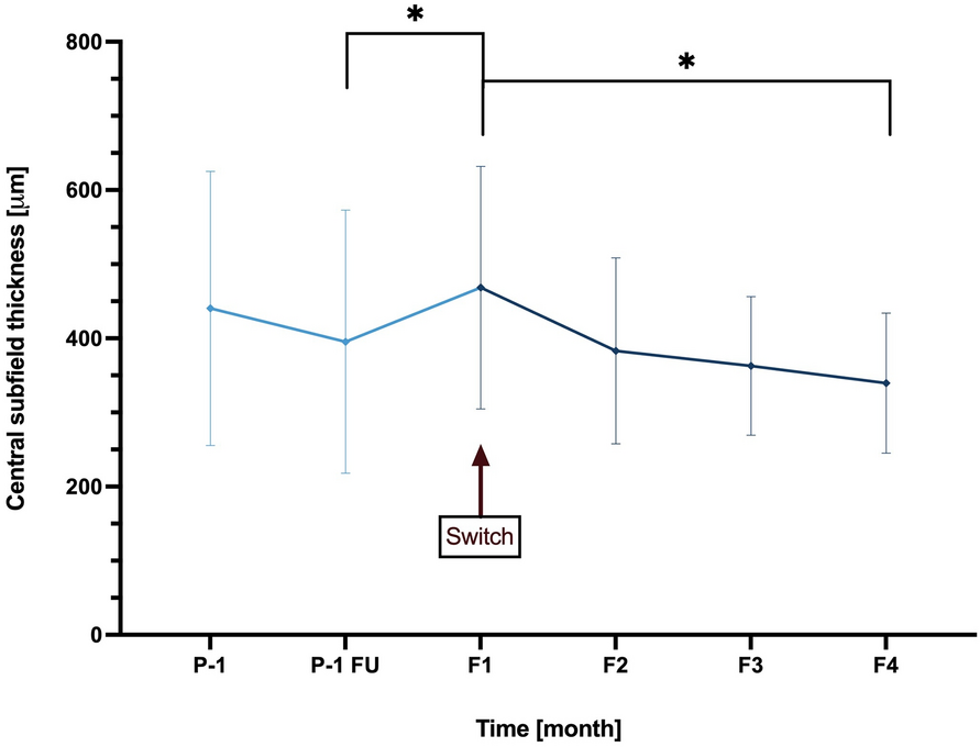 Prior to the first IVT in our department, the mean CST was 513.4 µm ± 187.6 µm (P0). During the pretreatment period, CST decreased to 440.3 µm ± 184.8 µm at the final IVT (P-1) before the switch. The Friedman test indicated no significant reduction in CST during this period (p = 0.207). The follow-up visit after P-1 showed a non-significant change in CST to 395.4 µm ± 177.5 µm (p = 1.0). By the time the decision was made to switch to faricimab (F1), the CST had significantly increased to 468.5 µm ± 163.6 µm (p = 0.018). After the initial faricimab treatment, CST decreased to 383.1 µm ± 125.3 µm (p = 0.207) after the first injection (F2), to 362.8 µm ± 93.4 µm (p = 0.079) after the second injection (F3), and to 339.5 µm ± 94.3 µm after the third injection (F4). The first significant reduction was observed after the third injection compared to both F1 (p < 0.001) and P0 (p = 0.001). Follow-up data for F4 were available for 18 of the 22 eyes. CST measurements over time are shown in Table 2 and Fig. 1.