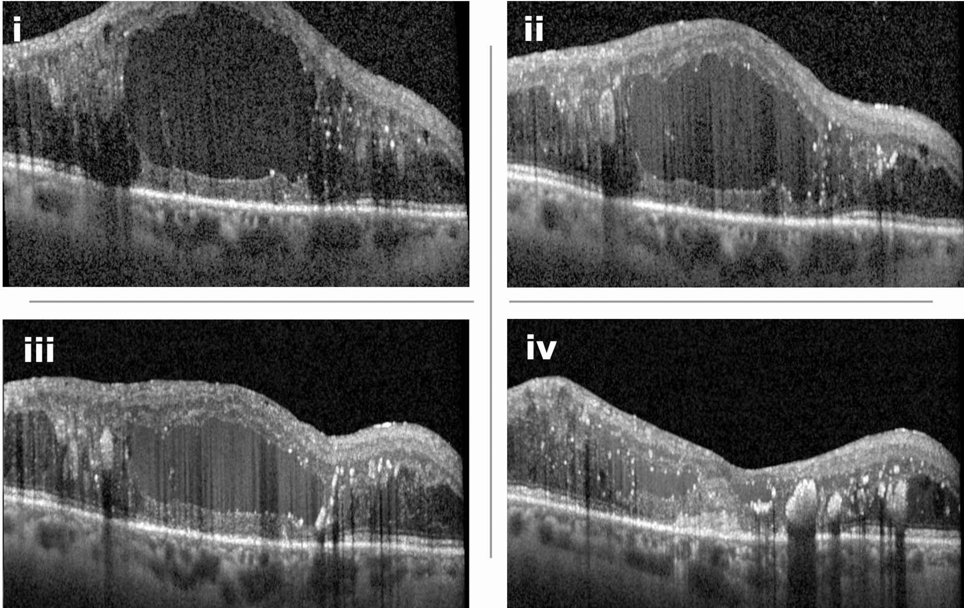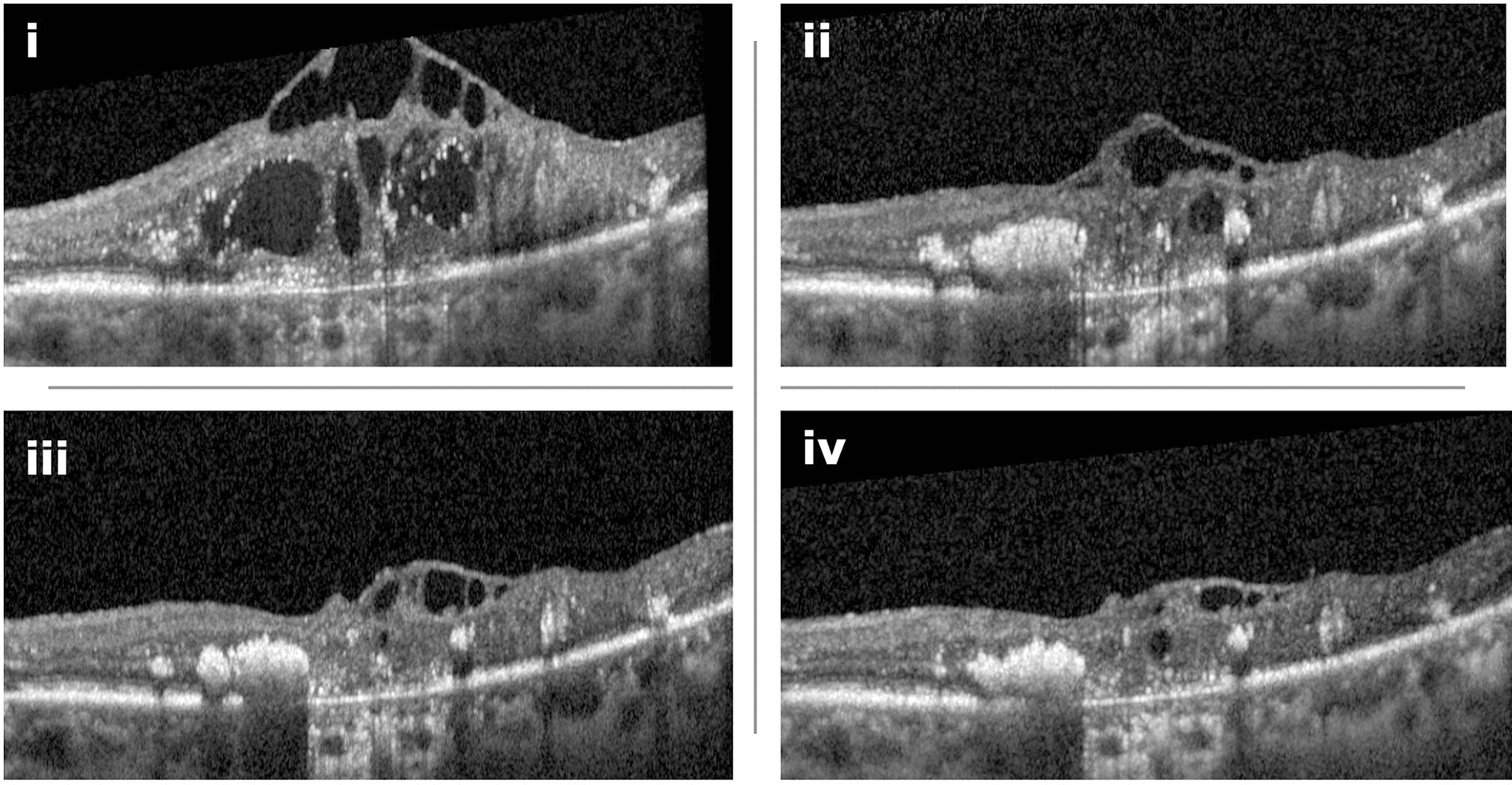 Example of a 74-year-old female patient who had received 24 intravitreal anti-VEGF injections prior to switching to faricimab. (i) Optical coherence tomography (OCT) scan before the switch shows pronounced diabetic macular edema (DME) with intraretinal fluid (IRF) and central photoreceptor layer and retinal pigment epithelium disruption, indicative of advanced retinal damage. (ii) One month after the first faricimab injection, there is a strong morphological response. (iii) Following the second injection, further gradual improvement in retinal morphology is observed, with a continued decrease in IRF. (iv) After the third injection, the OCT shows stable findings with minimal residual edema. Despite the anatomical improvement, visual acuity remains limited due to pre-existing, irreversible central retinal atrophy