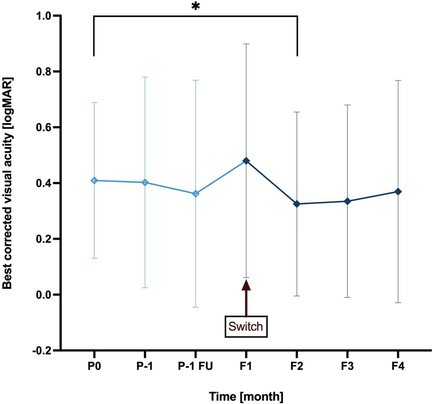 BCVA results are presented in Fig. 4 and Table 2. A slight improvement in BCVA can be observed, from 0.48 logMAR ± 0.42 logMAR at the visit before the switch to 0.33 logMAR ± 0.33 logMAR after the first faricimab injection (F2) and 0.37 logMAR ± 0.40 logMAR at the visit after the third faricimab injection (F4). However, these changes in BCVA were not statistically significant with the exception of BCVA improvement from P0 to F2 (p = 0.022).