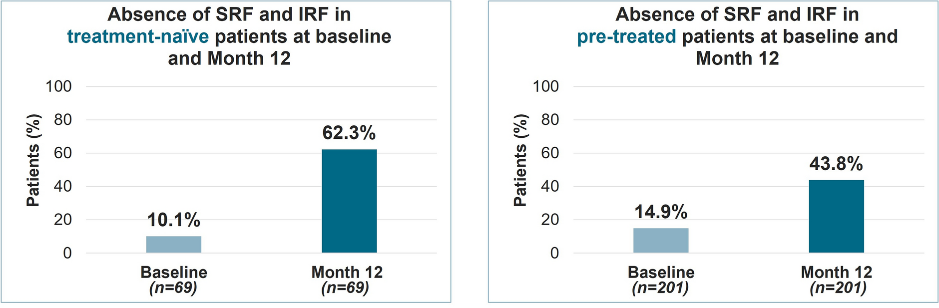 We also report that in patients without retinal fluid at baseline, maintenance of a dry retina (i.e., fluid absence at month 12 in patients without fluid at baseline) was achieved in 96.4–100% of treatment-naïve patients (SRF: 100%; IRF: 96.4%; sub-RPE fluid: 96.4%) and 82.2–92.4% of pre-treated patients (SRF: 82.2%; IRF: 92.4%; sub-RPE fluid: 88.3%). This finding is particularly significant as it has been recently shown that stability of retinal anatomy is an important predictor of visual outcomes in nAMD [21].