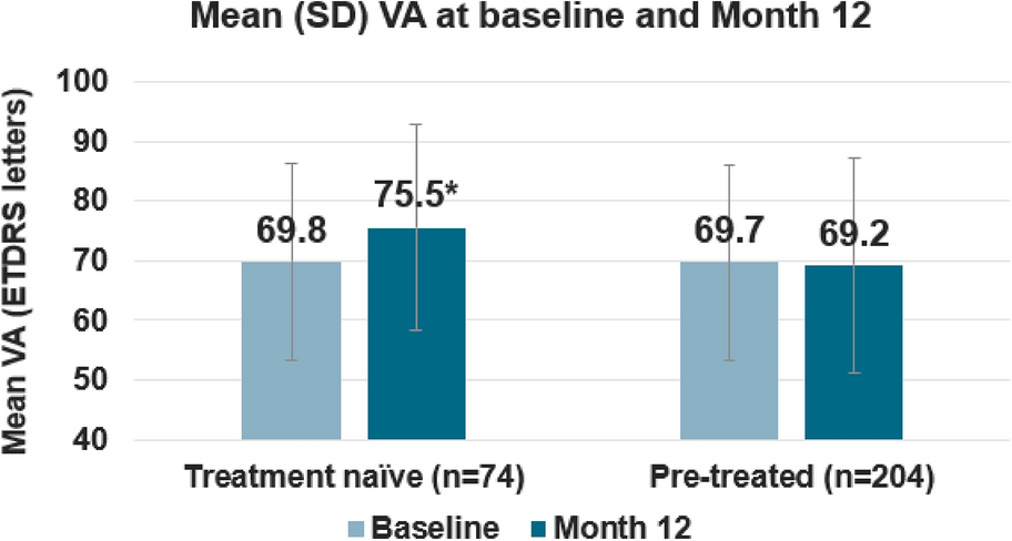 The clinical characteristics of the study groups at baseline are outlined in Table 2. Most patients had choroidal neovascularization (CNV) at baseline (83.9% of treatment-naive patients [n = 112] and 70.6% of pre-treated patients [n = 289]). Of the 270 patients with a minimum follow-up period of 12 months, 37 (13.7%) were free of intraretinal fluid (IRF) and subretinal fluid (SRF) at baseline (seven [10.1%] patients in the treatment-naive cohort and 30 [14.9%] patients in the pre-treated cohort). Of note, a total of 91 patients (20.8%) switched to another anti-VEGF during the 12-month follow-up period (14 [11.4%] of treatment-naive patients and 77 [24.4%] of pre-treated patients).