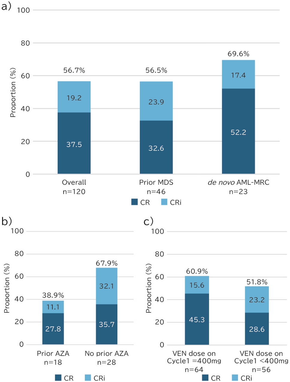 In our cohort, patients with a history of MDS had a lower response rate. This might be because patients with a history of AZA treatment had a lower response rate. These comprised approximately 40% of the prior MDS group, and had a CR + CRi prevalence of 38.9%, compared with 67.9% for those with no history of AZA treatment. Thus, previous AZA administration may reduce the responsiveness of patients to VEN + AZA [