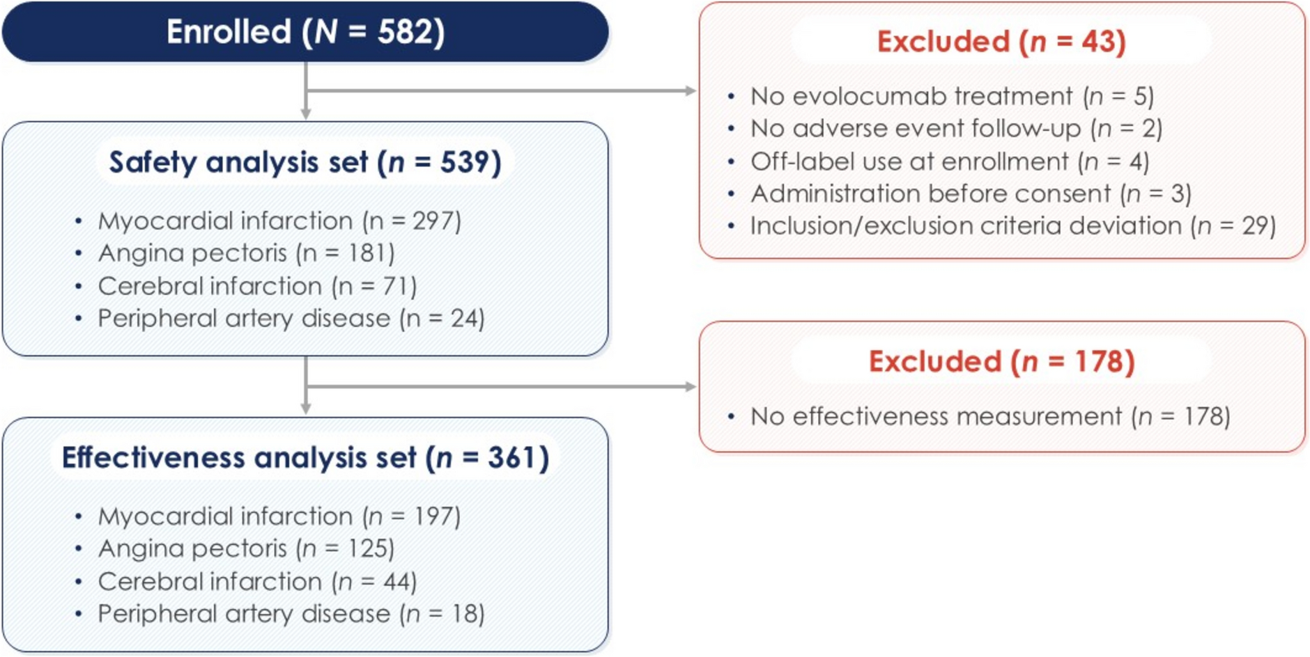 The primary outcome was the incidence (frequency and number) of AEs which were recorded by the investigator in the CRF throughout the follow-up period after the first administration of evolocumab. An AE was characterized as any negative medical incident occurring in a patient receiving evolocumab, regardless of whether it was related to the drug. All AEs were classified using the Medical Dictionary for Regulatory Activities (MedDRA) preferred term (PT). Only AEs reported during the use of evolocumab for approved indications in Korea were included in this analysis. An adverse drug reaction (ADR) was defined as any negative medical incident in a patient receiving evolocumab that was determined by investigators to be causally linked to the treatment. An SAE was defined as any AE that met at least one of the following criteria: is fatal or life threatening; requires in-patient hospitalization or prolongation of existing hospitalization; results in persistent or significant disability/incapacity; or is an “other significant medical hazard” that does not meet any of the above criteria.