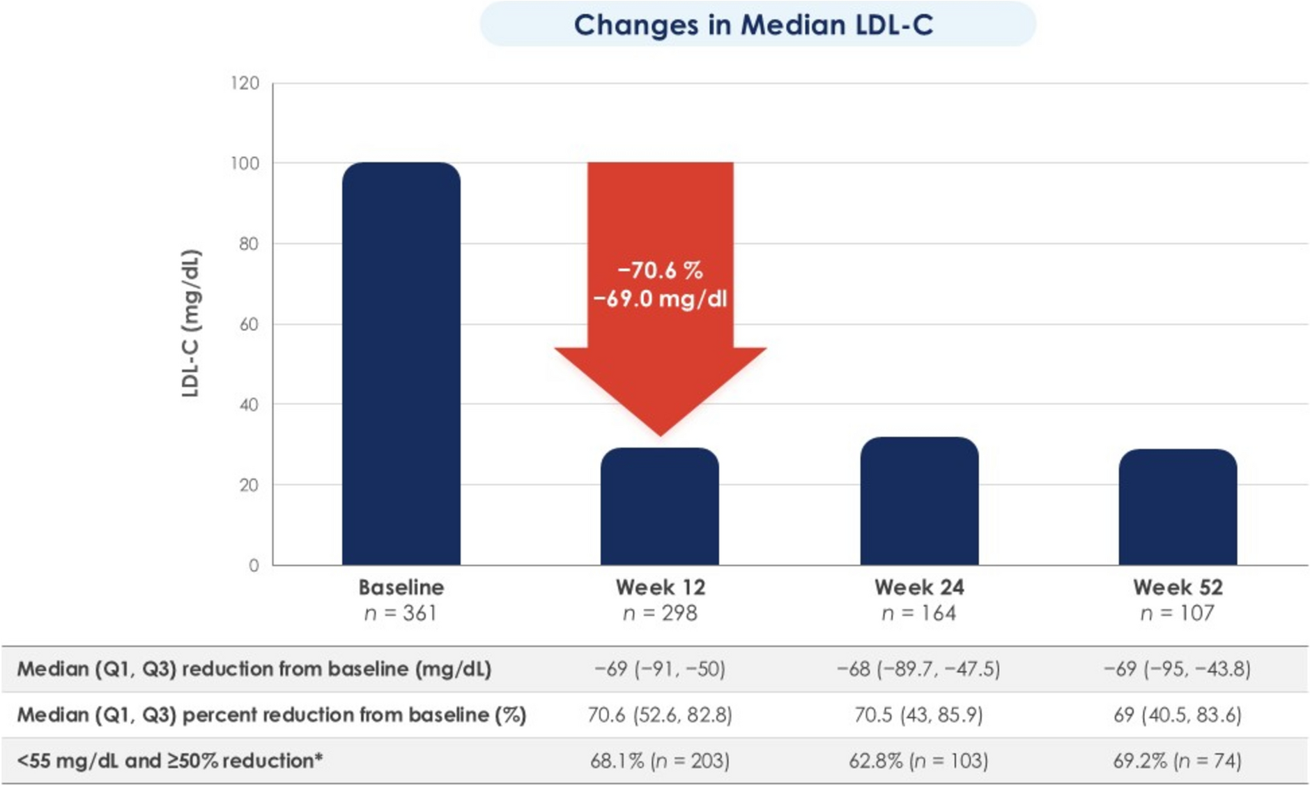 20], baseline LDL-C was 153.9 mg/dL and 131.5 mg/dL, respectively; with evolocumab treatment, median reduction from baseline was 58.0% and 70.2%, respectively, which remained stable over follow-up.