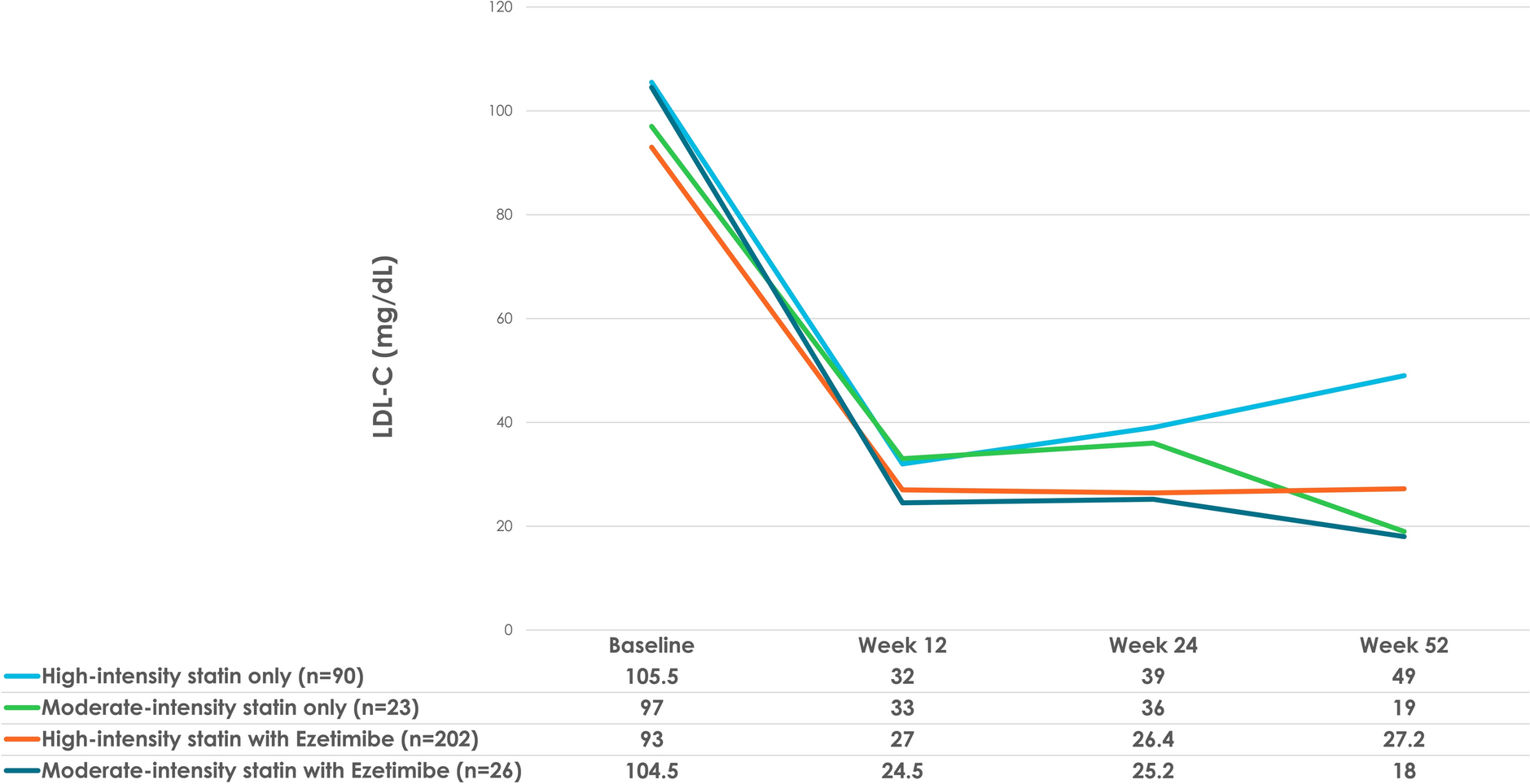 15], included high-intensity statin plus ezetimibe in just over half of all patients (51.9%), statin only in a third (33.2%), and ezetimibe only in 1.3%. This is a reflection of real-life clinical practice where adherence to guidelines/treatment may be suboptimal, yet additional LDL-C lowering for CV risk reduction in high-risk patients WITH ASCVD is paramount to reduce the burden of further CV events [