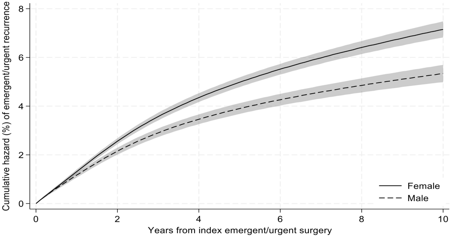 The primary outcome was recurrent emergent ventral hernia repair, identified throughout the follow-up period of 10 years after the index using the relevant ICD-9 or ICD-10 codes, admission status, and Medicare Beneficiary Identifier uniquely available for each patient.