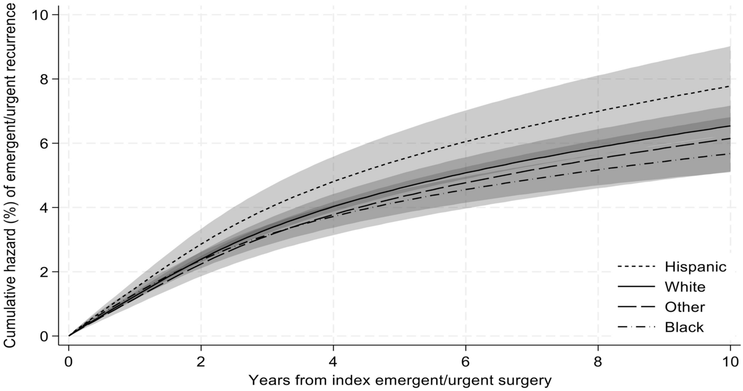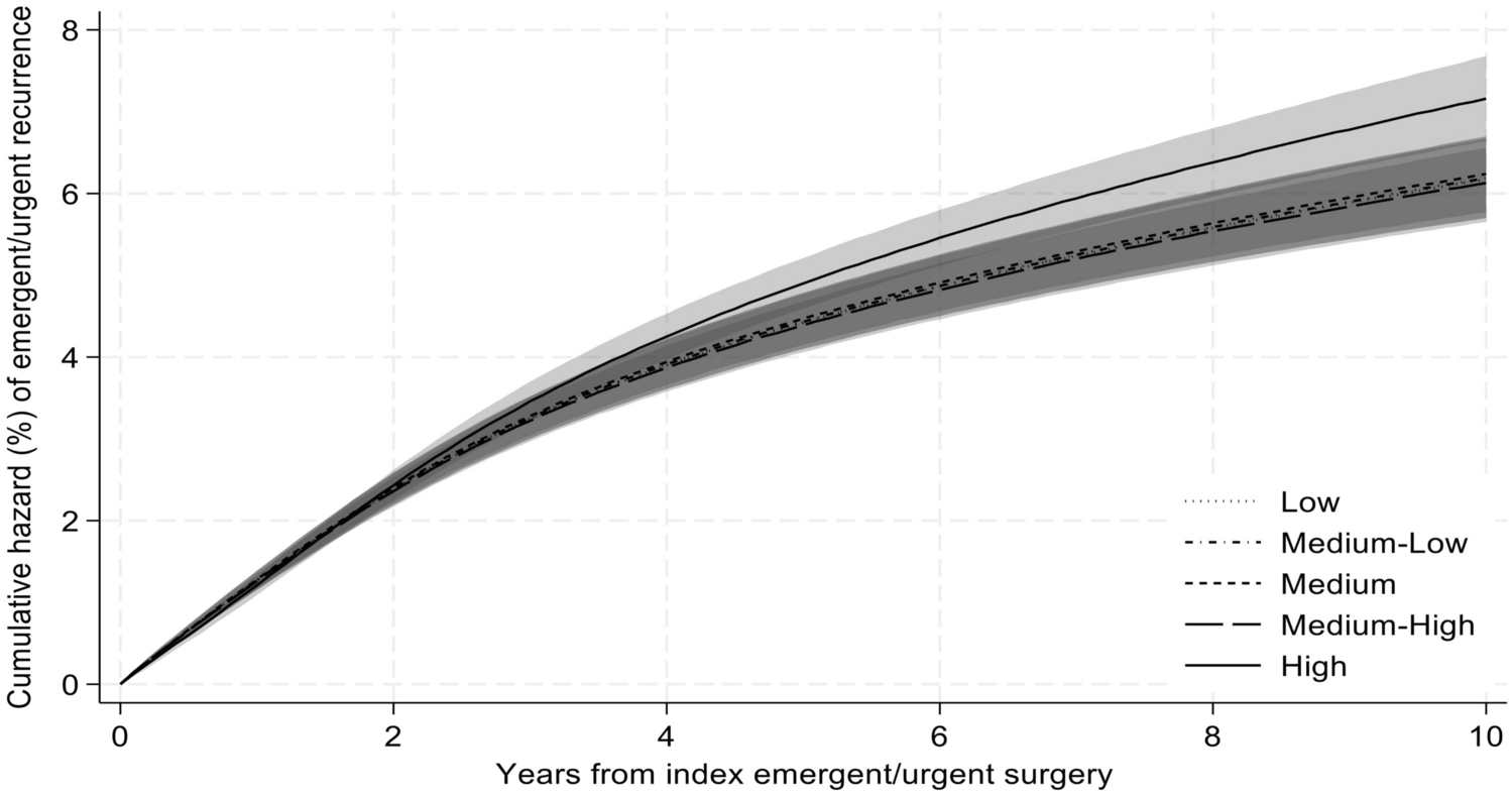 In this context, we designed a study to characterize patient, provider, and community factors associated with an increased risk of recurrent emergent hernia repair among Medicare beneficiaries, evaluating both clinical and social risks. Medicare data affords a unique opportunity to study this question given the comprehensive longitudinal data in the population most affected by emergent hernia surgery. We performed a risk-adjusted survival analysis for cumulative recurrent emergent hernia repair incidence within 10 years.