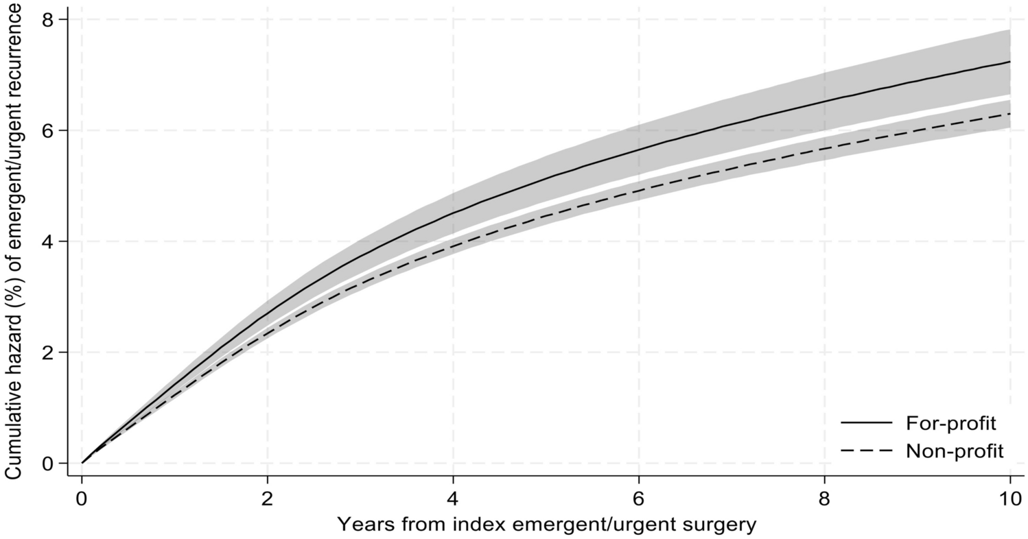 2]. This may indicate that the findings in that study were driven by the other included conditions, or that patients with multiple emergent operations face a more complex set of barriers aside from access to primary care. However, the association of for-profit hospital status and repeated emergent operations should prompt additional inquiry. One potential explanation for this is that for-profit hospitals tend to serve areas with higher unemployment and uninsured rates [