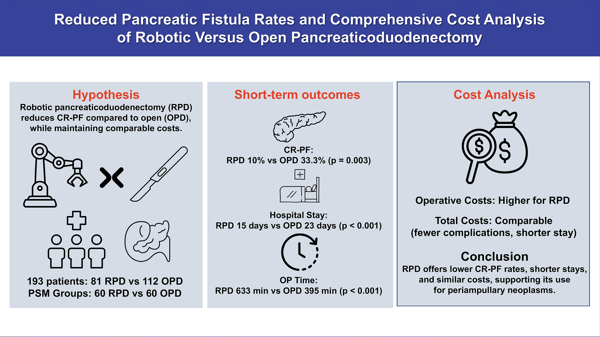 Furthermore, in recent years, a common belief has emerged within the surgical community that RPD is more expensive than open surgery due to the use of multiple robotic and laparoscopic instruments. However, the economic implications of these two techniques (RPD vs. OPD) remain underexplored. Previous investigations have been limited, including a small retrospective cohort study with fewer than 100 cases and a systematic review with meta-analysis, which was hindered by significant heterogeneity in the included studies that grouped laparoscopic and robotic procedures under the broad term "minimally invasive surgery" [