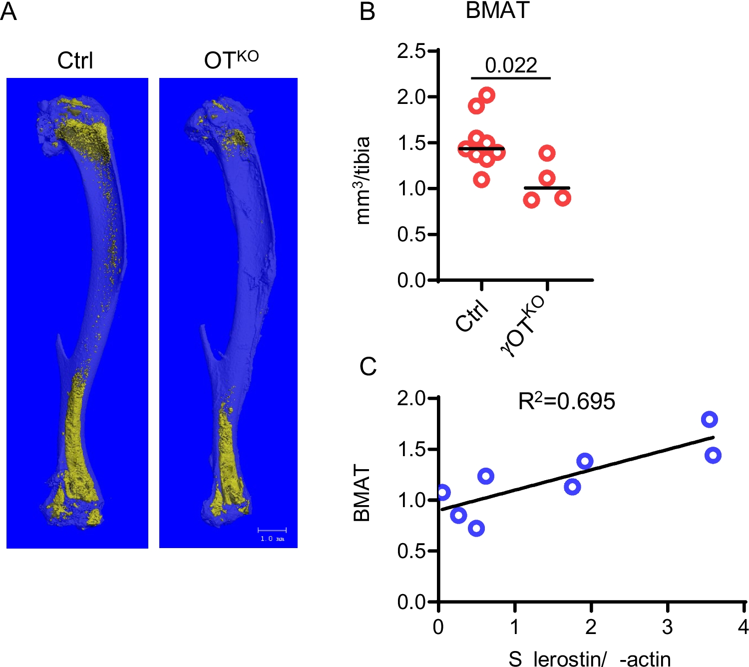 BMAT volume in tibia of Ctrl and γOTKO mice. A MicroCT renderings of OsO4 stained tibia of 7-mo-old females. B Volumetric measurements of BMAT volume in 7-mo-old female tibia. C Pearson correlation of BMAT volume (determined by microCT) and sclerostin protein levels (determined by Western blot) in osteocytes of Ctrl and γOTKO 6.5-mo-old male mice. From Baroi et al. (ref. 4)