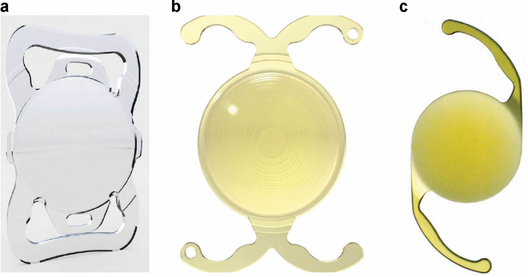 The eye specialist informed all patients about the characteristics of each IOL. The IOLs were selected according to patient demands. FEMTIS is a haptic-designed, hydrophilic, acrylic plate with four flanges for capsulorhexis fixation (Fig. 1a). It has an anteroposterior, aspheric, biconvex optic with a diameter of 5.7 mm, an overall length of 10.5 mm, and no haptic angulation (0°). FineVision is a hydrophobic, acrylic, single-piece IOL with double C-loop haptics (Fig. 1b). It has an anteroposterior, aspheric, biconvex optic with a diameter of 6.0 mm, an overall length of 11.4 mm, and a haptic angulation of 5°. AcrySof IQ is a hydrophobic, acrylic, single-piece IOL with a single C-loop haptic (Fig. 1c). It has an anteroposterior, aspheric. biconvex optic with a diameter of 6.0 mm, an overall length of 13.0 mm, and a haptic angulation of 0°.