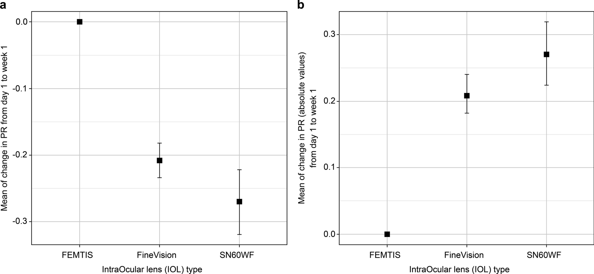 Graph showing the mean change in PR in real (a) and absolute (b) values between day 1 and week 1 postoperatively by lens type. Square dots represent the median values of the shifts, and the upper and lower whiskers represent the upper and lower percentiles
