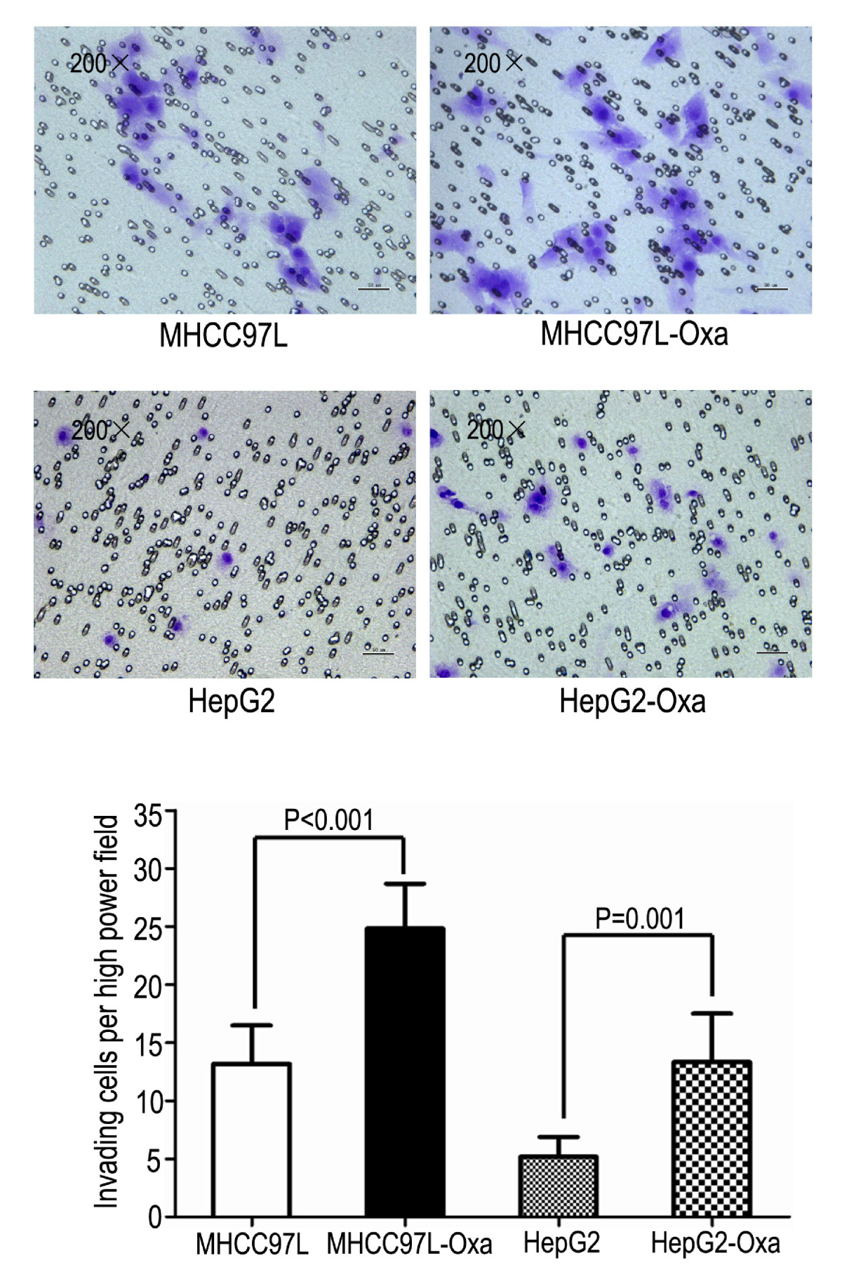 MHCC97L or HepG2 cells were plated in six-well tissue culture plates (1 × 105 cells/well). After 24 h, the medium was replaced with DMEM containing 10% FBS and 2 μmol/L oxaliplatin. After 48 h, the medium was changed, and drug treatment was terminated. Cells were allowed to recover, and when the surviving populations reached 80% confluence, cells were passaged and exposed to oxaliplatin again for 48 h. During 6 weeks of treatment this process was repeated for a total of four 48-h exposures to oxaliplatin. Cells surviving treatment (Oxa cells) were designated MHCC97L-Oxa and HepG2-Oxa, respectively. The morphological characteristics of parental and Oxa cells were compared by microscopy (Olympus, Tokyo, Japan).