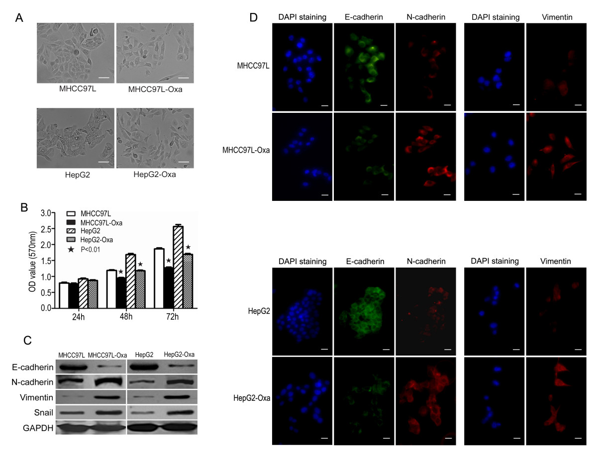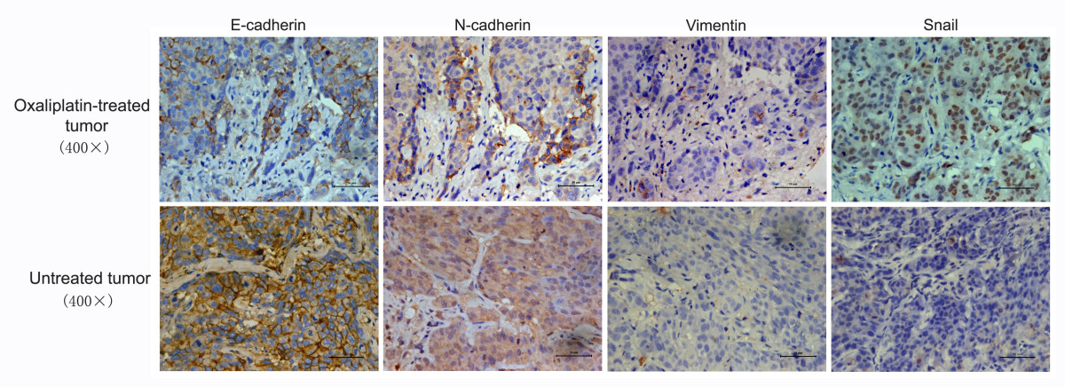 Oxaliplatin was purchased from Sigma Chemical Co. (St. Louis, MO, USA). Monoclonal antibodies used in immunofluorescence, immunoblotting, and immunohistochemistry included: rabbit anti-human vimentin, Twist, and Slug (Santa Cruz Biotechnology, Santa Cruz, CA, USA), rabbit anti-human E-cadherin and Snail (Abcam Ltd., Cambridge, UK), mouse anti-human N-cadherin (Abcam Ltd, Cambridge, UK.), mouse anti-human GAPDH (Chemicon, CA, USA) and mouse anti-human Ki-67 (Dako, Glostrup, Denmark).