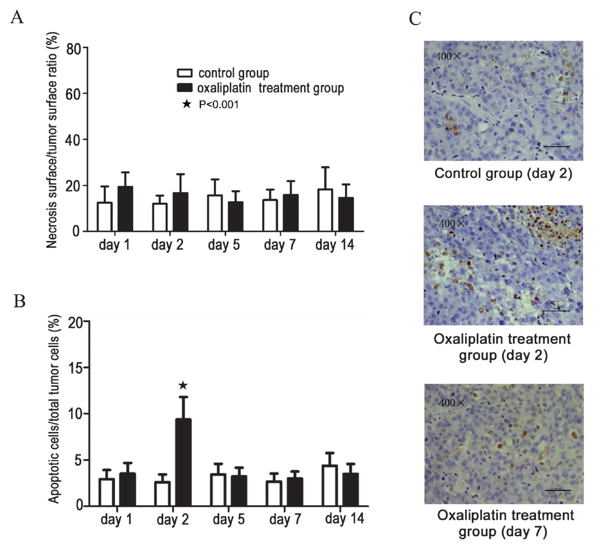 n = 30) received 0.2 mL of 0.9% sodium chloride (i.p.) on those days. On days 1, 2, 5, 7 and 14 after the final treatment, six mice from each group were sacrificed by cervical dislocation. The necrosis and apoptosis of tumors in each group were compared.