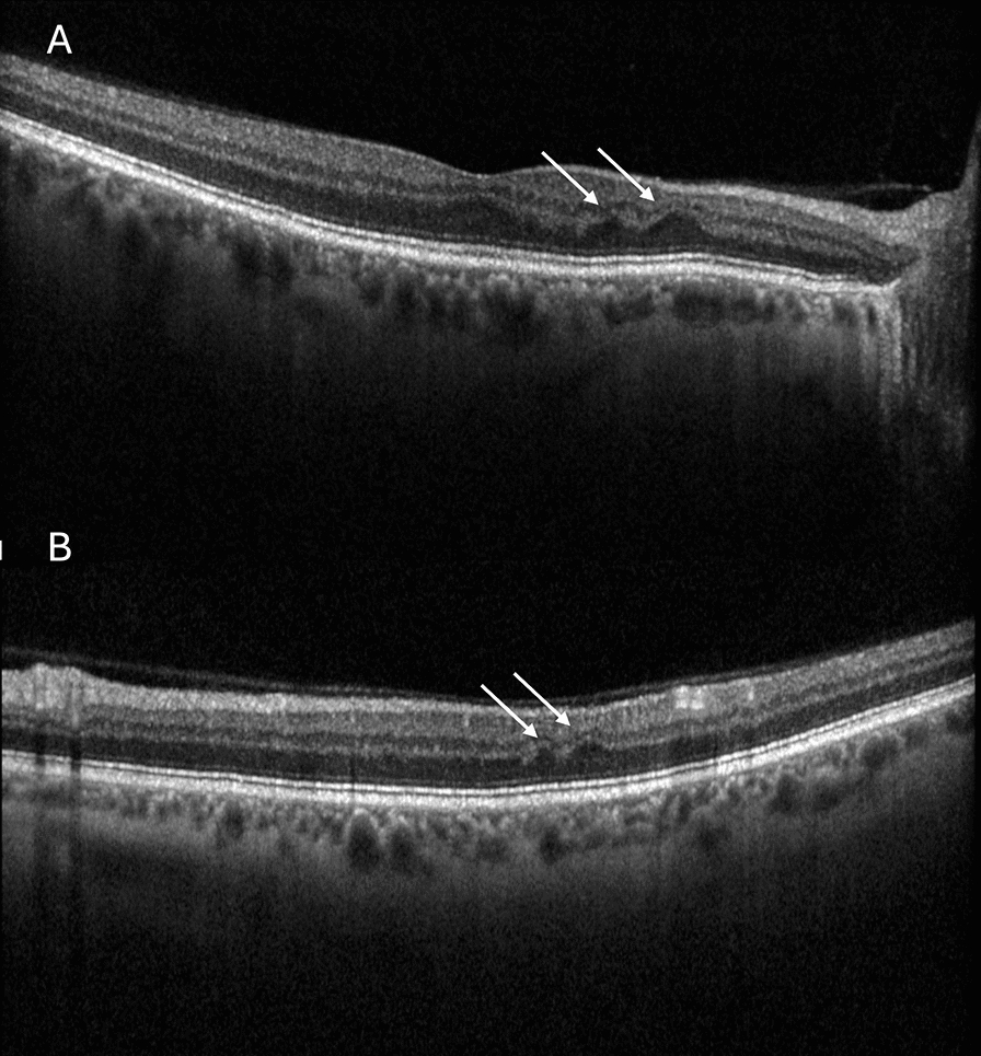 Retinal ischemic perivascular lesions (RIPLs) are focal thinning of the inner nuclear layer with outer nuclear layer expansion identified by spectral domain optical coherence tomography (SD-OCT) resulting from hypoperfusion in the deep capillary plexus. |
