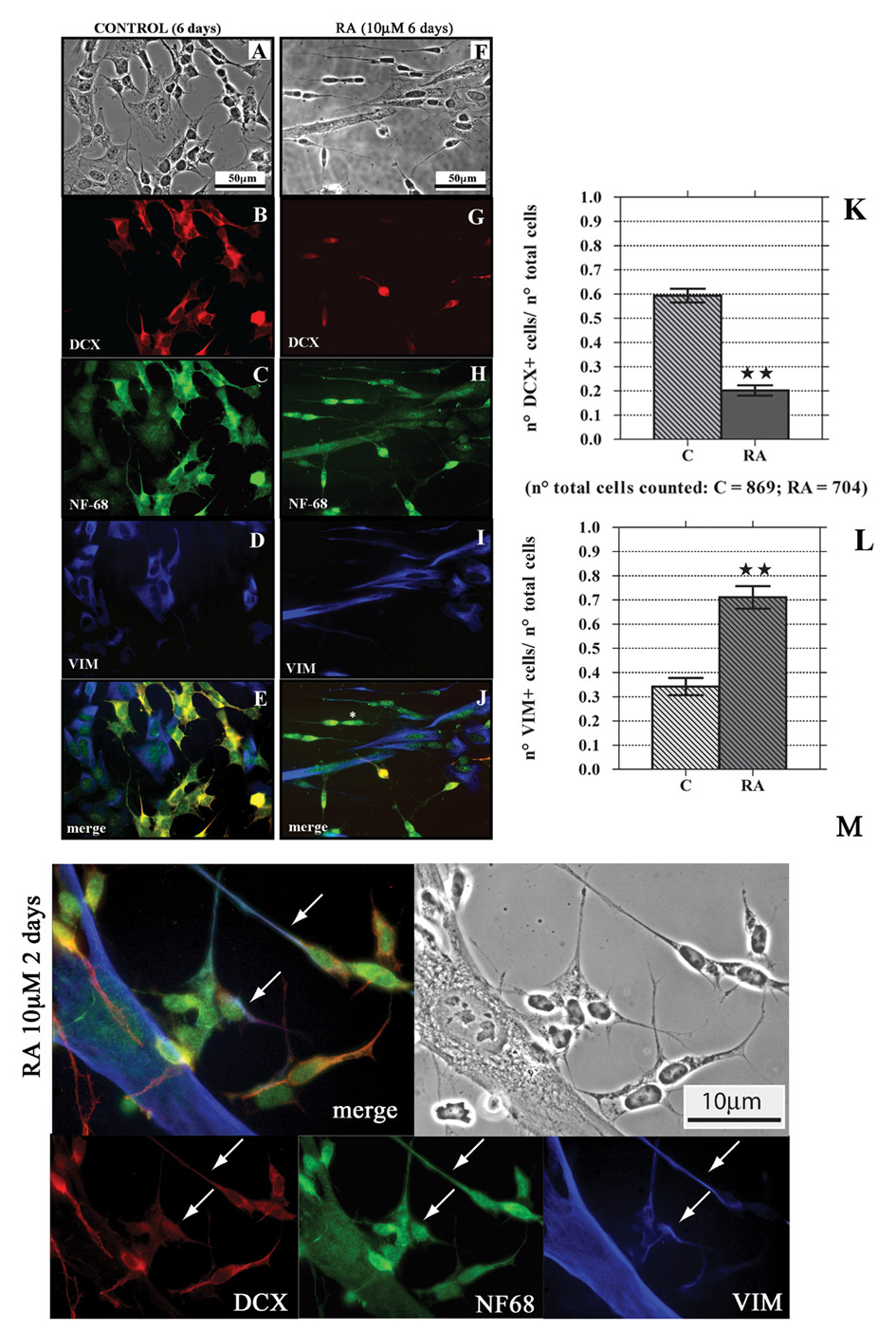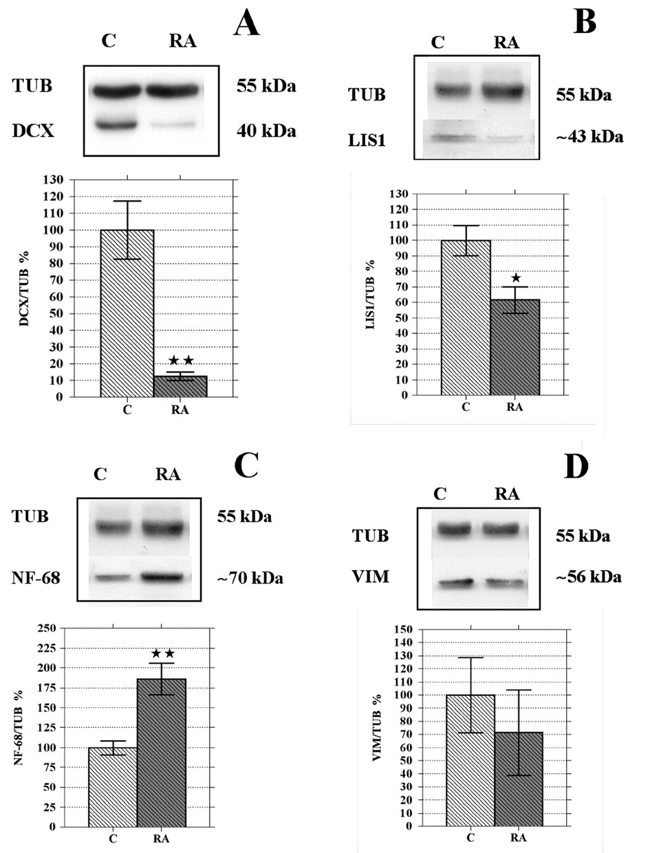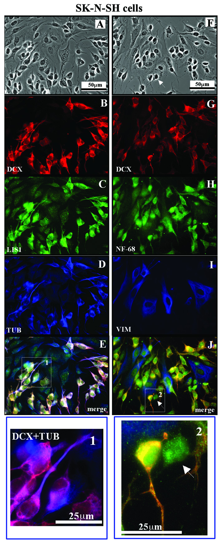 In the present study we have analysed by immunofluorescence (IF) the presence of DCX and LIS1 in the different cell subtypes that constitute the SK-N-SH neuroblastoma cell line. We have also correlated the intracellular localization of these two proteins with tubulin and with two intermediate filaments: vimentin (VIM) and neurofilament-68 (NF-68) that have been utilized as possible cell-subtype specific markers. Furthermore, we have investigated by IF and WB analysis whether a treatment with the differentiating agent RA might induce modifications on DCX, LIS1, VIM and NF-68 expression. In addition, motility and invasiveness of SK-N-SH cells have been studied by wound scratch test [