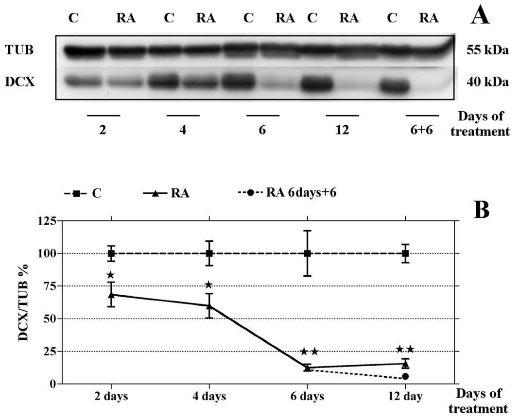 31]. In N-type cells, we observe that DCX level starts to decrease after 2 days of RA exposure and reaches the lowest value after 6 days of treatment. It should be noted that DCX level remains very low also after RA treatment withdrawal. Altogether, the results here reported indicate that DCX down-regulation starts very early after the onset of RA treatment, it is progressive, time-dependent, and irreversible.