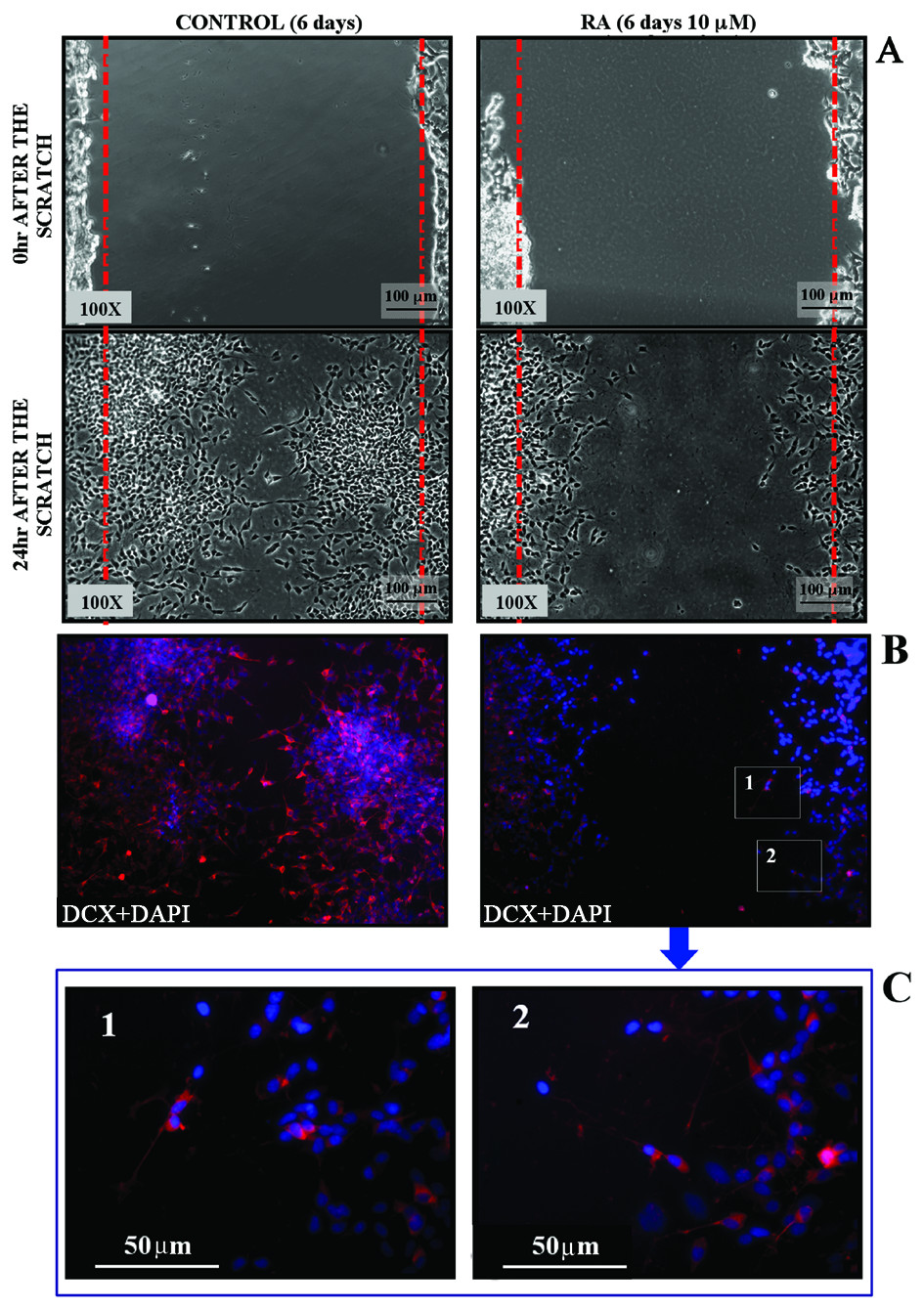 24]. In this regard, it is important to underline that our results on SK-N-SH motility have been obtained by scratching the cell monolayer after 6 days RA treatment, when DCX expression reaches the lowest values.