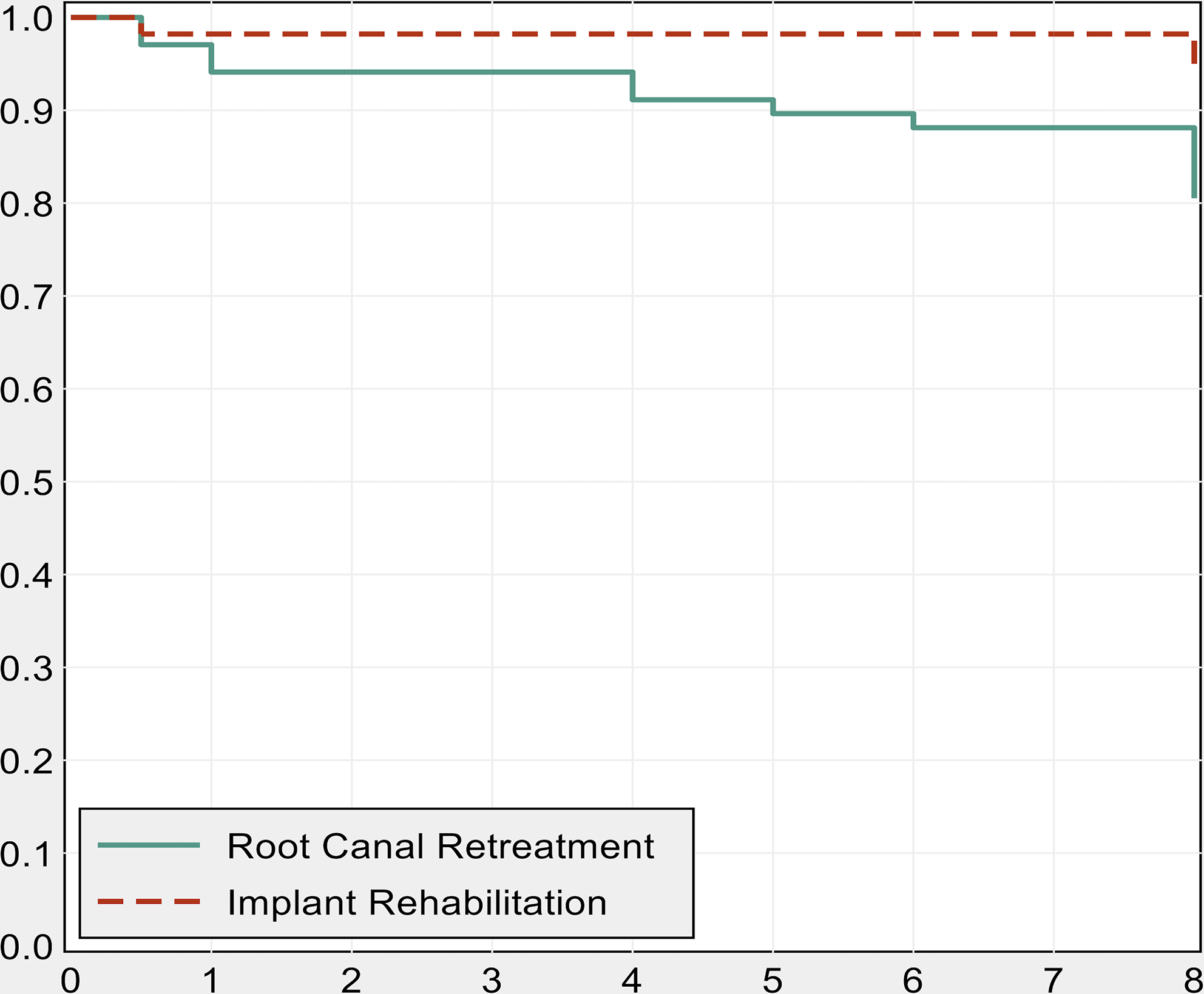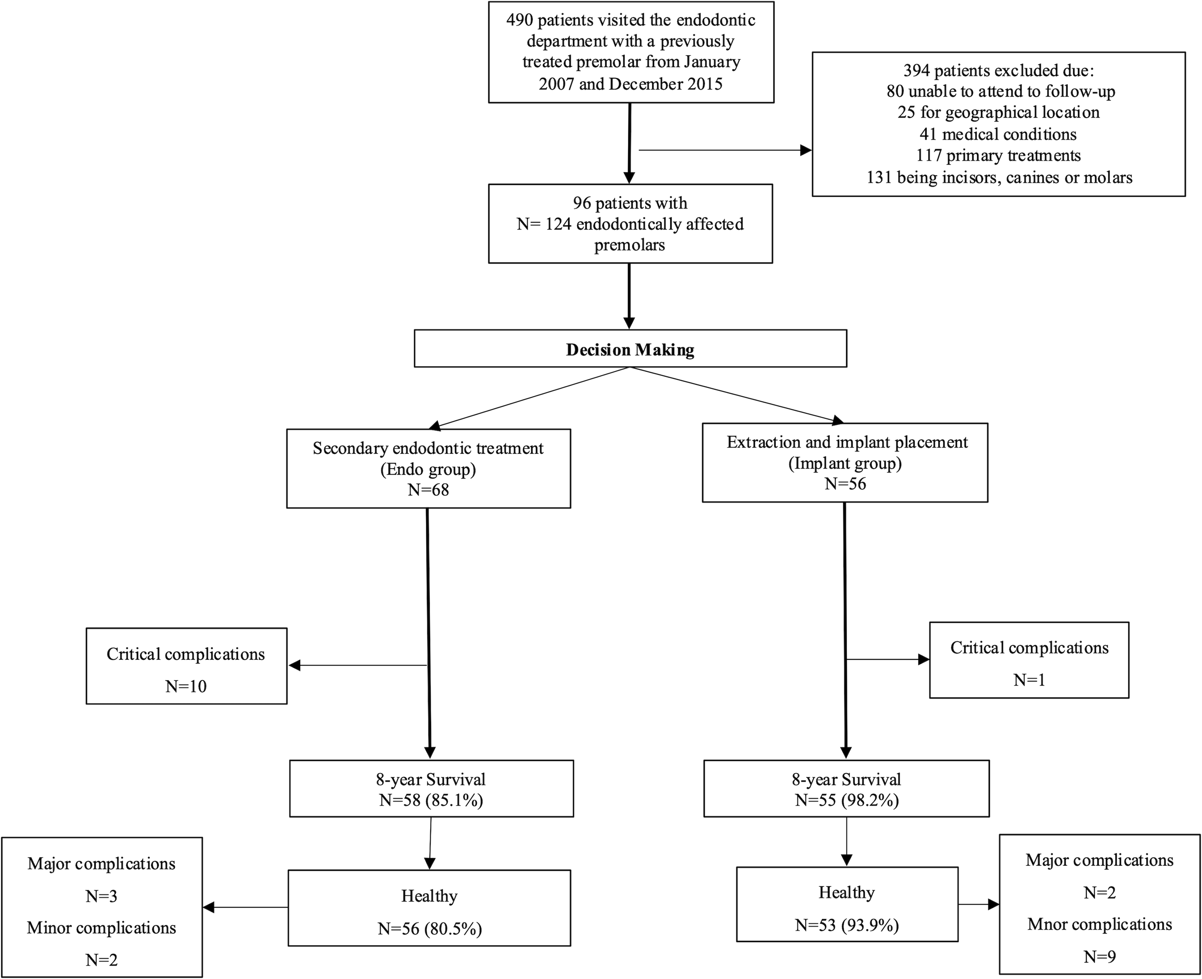 The study evaluated previously-endodontically-treated premolars affected by periapical lesions and/or secondary caries requiring a multidisciplinary decision between (non-surgical) retreatment or extraction and implant replacement over an 8-year minimum follow-up.