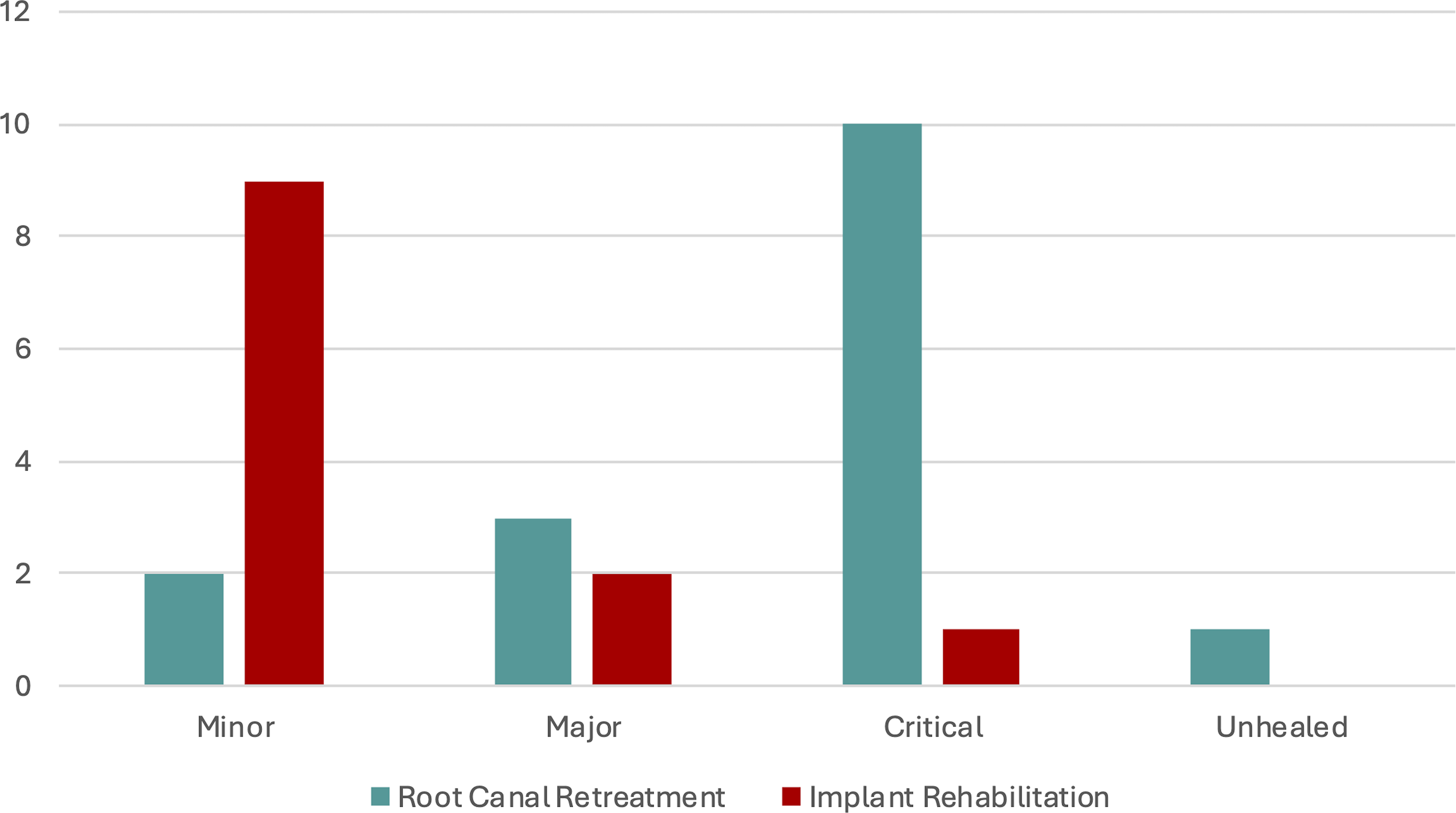 Major: complications that affected the endodontic outcome/healing/success and required a reintervention but did not undermine tooth survival (e.g. persistent periapical lesion).