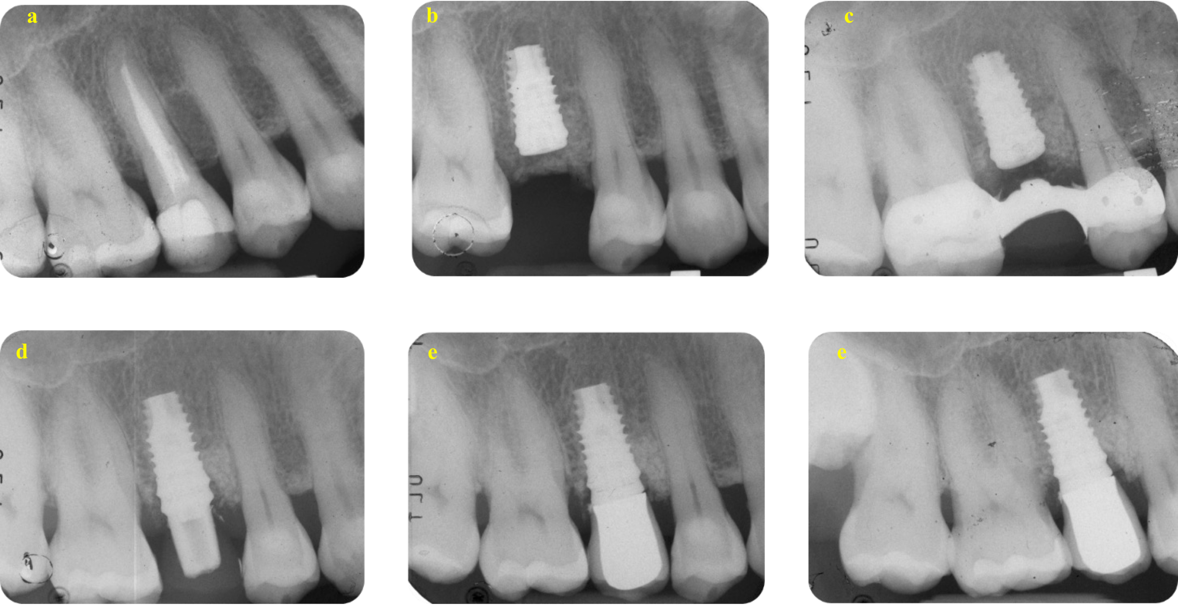 Provisional crowns were prepared after 3 months from tooth build-up and fixed with a temporary cement (Temp Bond, Kerr, USA). Final metal-ceramic or zirconium single crowns were placed and cemented with a definitive powder liquid cement (Polycarboxylate, Heraeus Kulzer, Germany) after 6 months from tooth build-up. The crown rehabilitation was performed in 46 out of 68 (68%). All teeth were in occlusal contact and were not used as abutments for multiple fixed restorations.