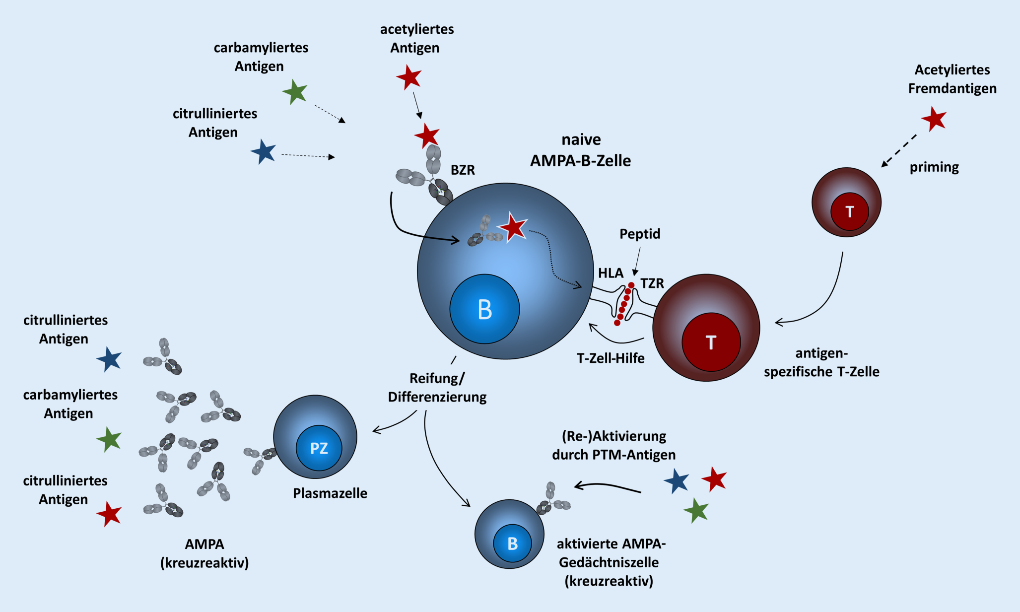 Konzept der Entwicklung der autoreaktiven AMPA-Immunantwort am Beispiel eines acetylierten Antigens. Da AMPA primär die Proteinmodifikation erkennen und für unterschiedliche Modifikationen kreuzreaktiv sind, kann eine naive oder Gedächtnis-AMPA-B-Zelle durch verschiedene PTM-Proteine stimuliert werden und mithilfe von T‑Zellen ausreifen. Hierbei kann die Affinität für individuelle PTMs durch somatische Hypermutation zu- oder abnehmen. NB: Die Kreuzreaktivität im naiven Repertoire ist noch nicht formell gezeigt worden. TZR T-Zell-Rezeptor, BZR B-Zell-Rezeptor