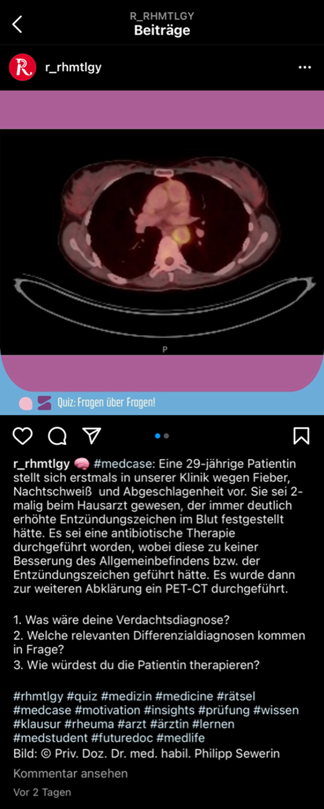 Von Bedeutung sind insbesondere videobasierte Wissensformate. Hier kommt u. a. der Plattform YouTube eine besondere Rolle zu. Auch im Kontext von rheumatologischen Themen erhält die Plattform immer größeren Zulauf [8‐10]. In mehreren aktuellen Studien wurde die Qualität von Informationen aus YouTube-Videos analysiert. Hierbei zeigte sich, dass die meisten Videos im Kontext von rheumatologischen Themengebieten einen hohen Informationsgehalt sowohl für medizinisches Fachpersonal als auch für Patient*innen vorweisen. Weiterhin existieren sowohl zu einzelnen rheumatologischen Erkrankungen als auch zu medikamentösen Therapieoptionen zahlreiche qualitativ hochwertige Videos auf der Plattform [8‐10]. Ähnlich spielt auch Instagram eine immer größere Rolle in der Wissensvermittlung in der Rheumatologie. Hier zeigte eine jüngste Analyse rheumatologischer Inhalte der Plattform, dass Videoinhalte signifikant mit einer höheren Anzahl an Likes korrelierten [11].