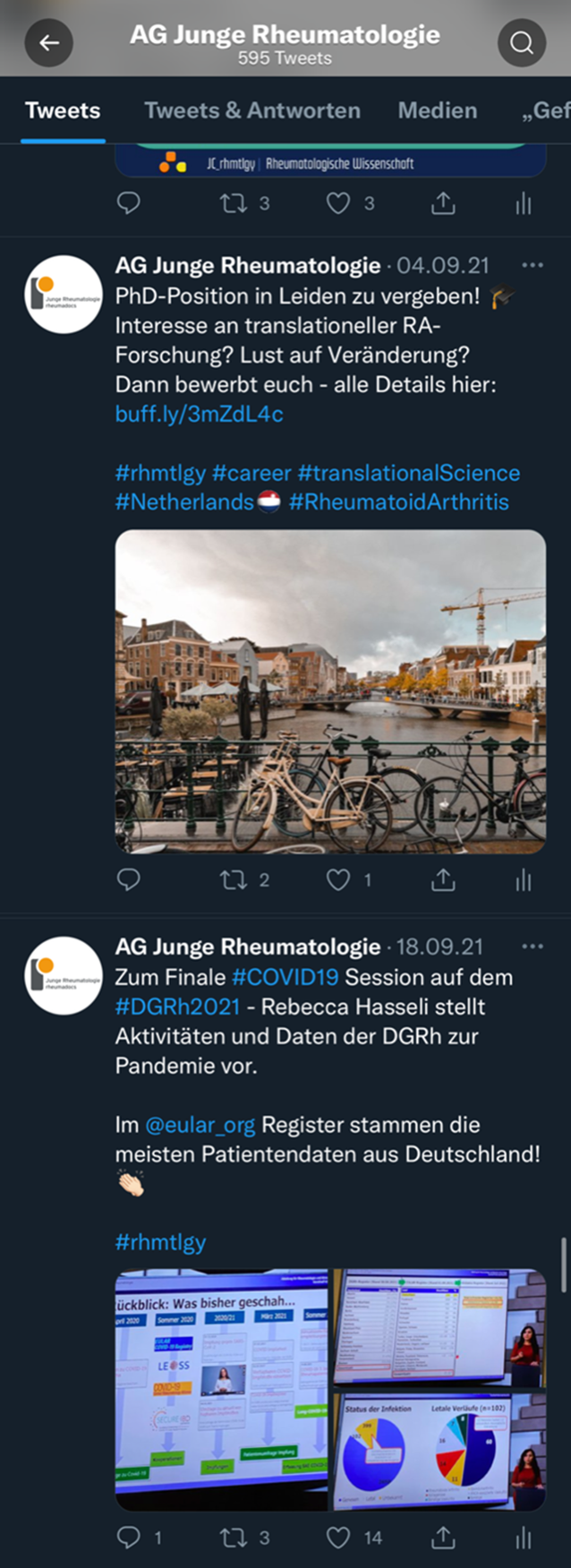 Insbesondere im Rahmen von wissenschaftlichen Konferenzen und Meetings setzen viele Teilnehmer*innen auf die Verbreitung von Kongressinhalten über soziale Medien. Dies erhöht die Reichweite der entsprechenden Inhalte und ermöglicht eine ortsungebundene Diskussion über den Kongress hinaus [35]. So haben auch beim DGRh-Kongress 2021 Rheumatolog*innen v. a. auf Twitter unter dem Hashtag #DGRh2021 live berichtet. Über den Account der AG Junge Rheumatologie wurden viele der kongressbezogenen Beiträge geteilt (s. auch Abb. 2). Gerade bei einer Vielzahl teils paralleler Kongressangebote können Follower*innen so einen Eindruck weiterer Inhalte und Diskurse gewinnen. Vor einem solchen Hintergrund hat auch das American College of Rheumatology beim ersten virtuellen ACR-Kongress im Jahr 2020 gezielt Medical Influencer als Twitter-Botschafter (ACR Twitter Ambassador) gewonnen, um die Bekanntheit der Konferenz zu erhöhen und die Konversationen darüber zu beleben.