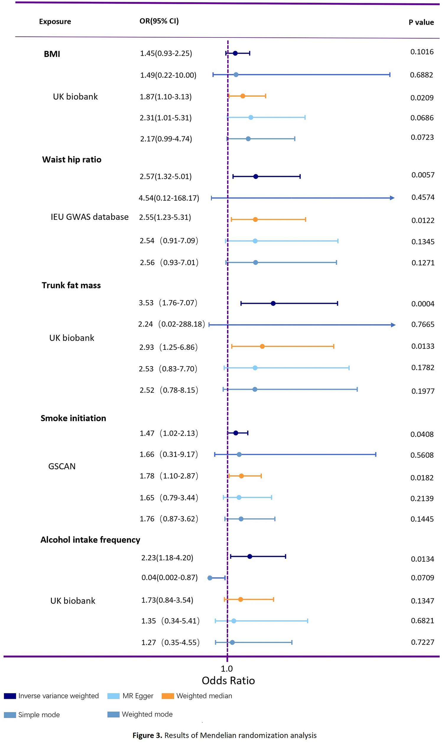 The robustness of the primary results was assessed through sensitivity analyses which included examining each single-nucleotide polymorphism SNP individually and calculating the combined effect by using leave-one-out method. Heterogeneity assessed by Cochran's Q test and pleiotropy evaluated by MR-Egger regression are displayed in Table 1. Notably, based on both IVW and MR-Egger regression analyses, no heterogeneity is detected among the results. In MR-egger analysis, we found horizontal pleiotropy only for alcohol intake frequency (P = 0.03), but not for smoke initiation, BMI, trunk fat, waist–hip ratio. Furthermore, the leave-one-out sensitivity analysis demonstrated that no single SNP significantly influenced the overall causal effects. The detailed outcomes from leave-one-out sensitivity analysis can be found in the Supplementary Material.