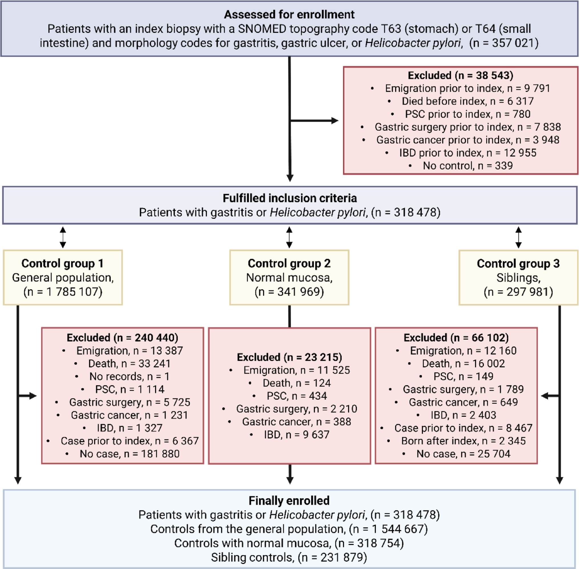 Three types of controls were used: (1) Up to five individuals from the general Swedish population, matched with cases at the date of index biopsy based on age, sex, calendar year (year of biopsy), and county, (2) patients from the ESPRESSO study with normal gastric mucosa (SNOMED codes: M00100 or M00110) and (3) full siblings identified through the Multi-Generation register. Exclusion criteria were also applied to controls.