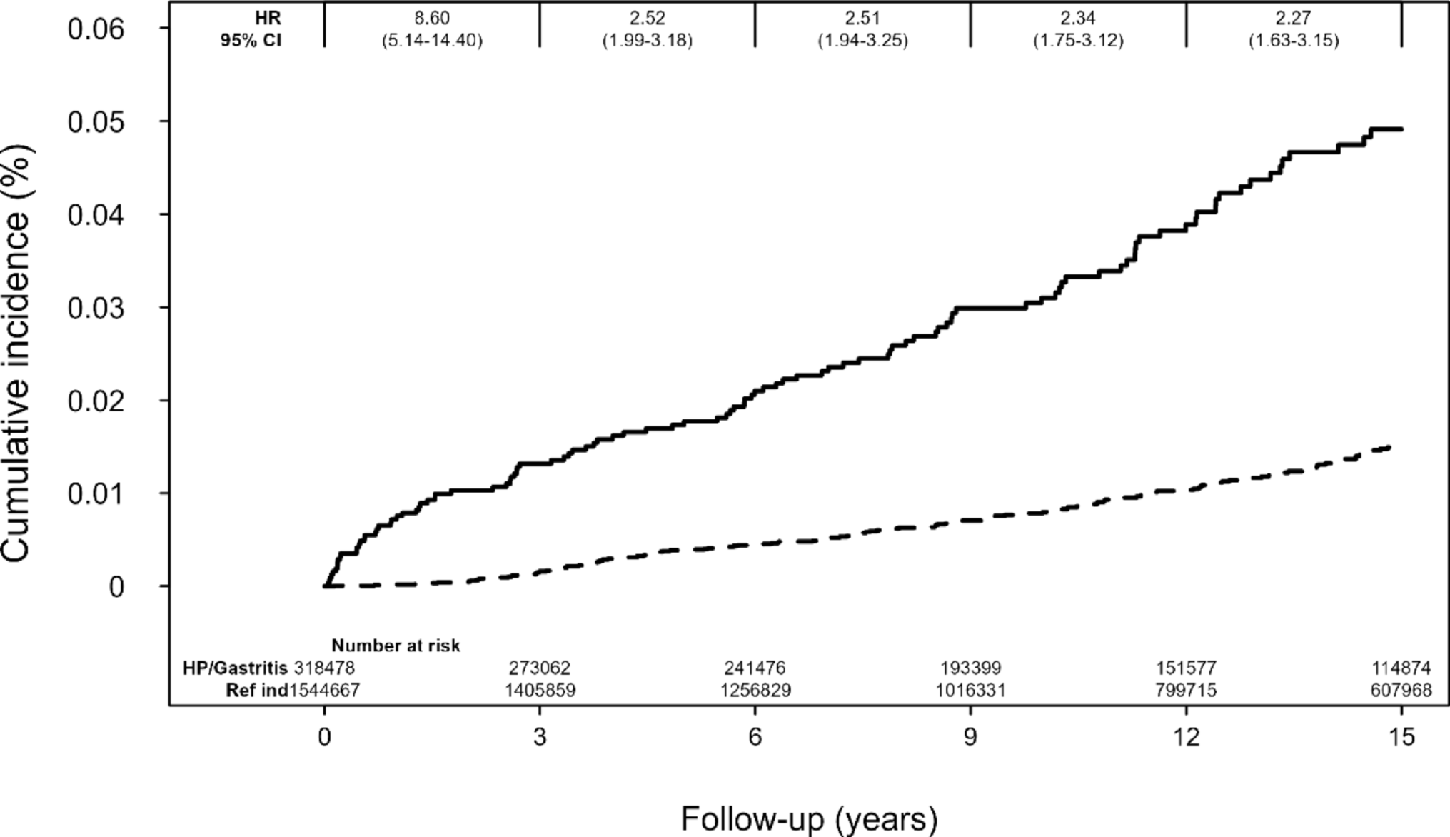 The association between a diagnosis of gastritis/H. pylori was stable during the follow up period, as shown by the cumulative incidence curves in Fig. 2.
