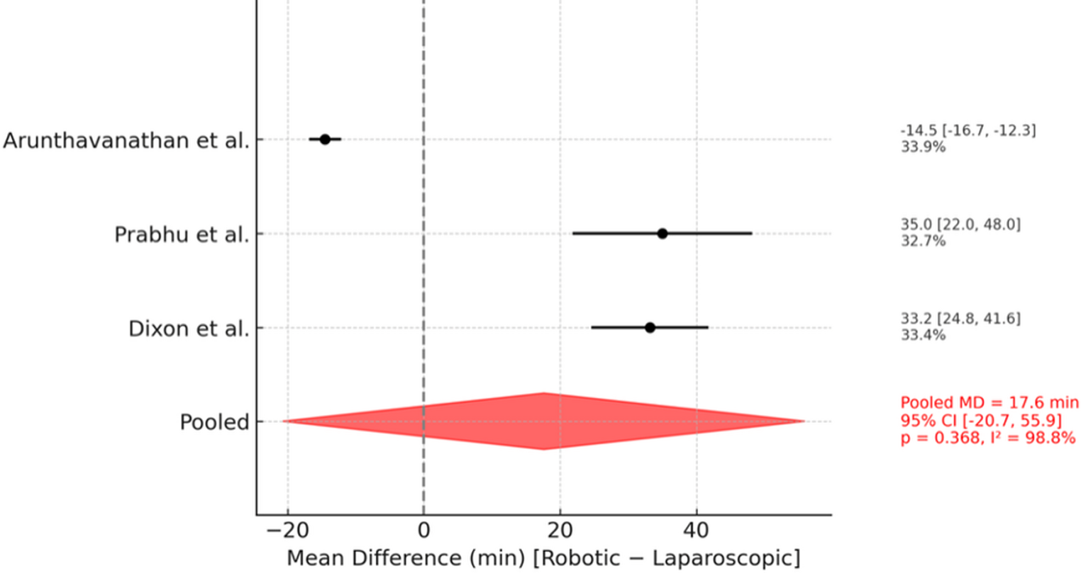 All three RCTs reported operative time [8, 17, 18]. The pooled mean operative time was 67.3 ± 17.9 min in the robotic group and 49.4 ± 13.1 min in the laparoscopic group. The random-effects meta-analysis showed no significant difference (mean difference [MD] + 17.6 min; 95% CI: −20.7 to + 55.9; p = 0.37; I² = 98.8%) (Fig. 2). Given the small number of trials, we did not emphasize subgroup or leave-one-out analyses; instead, we explored heterogeneity qualitatively in the discussion section.