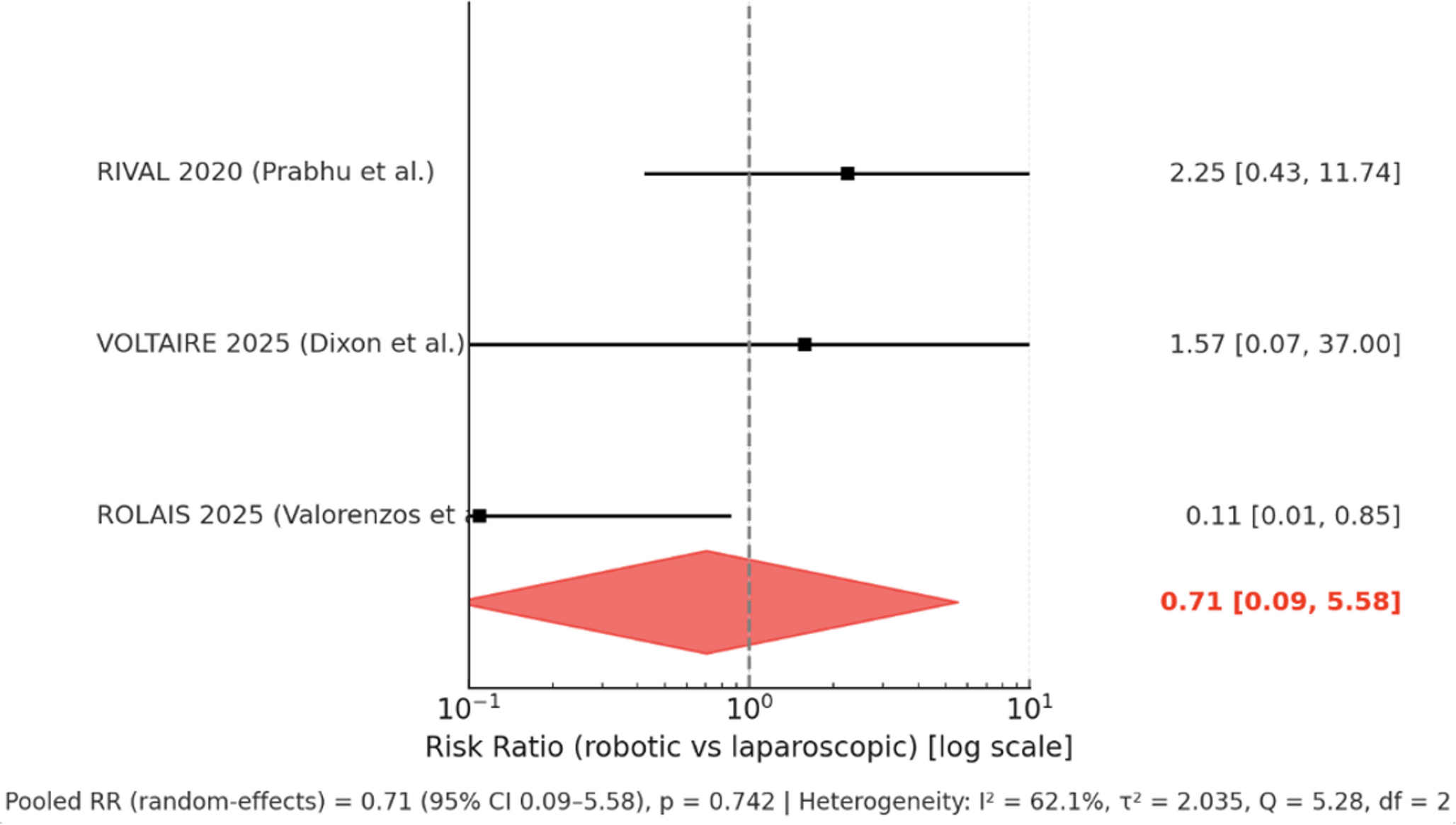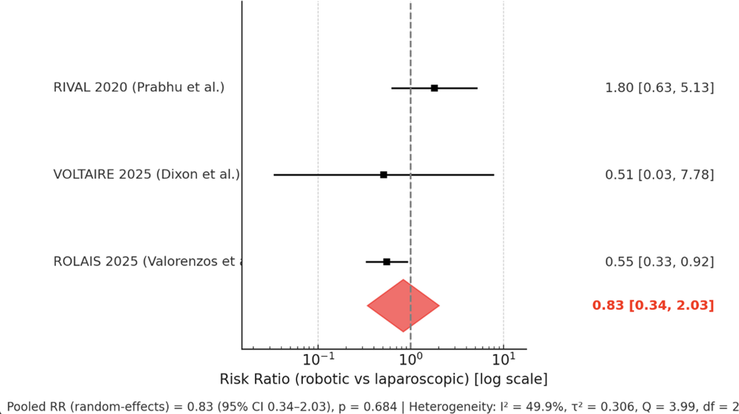 Previous systematic reviews [6, 9‐11] have shown similar complication rates but longer operative times for robotic repair, findings that may have been confounded by the inclusion of cases performed during surgeons’ learning curves. Notably, no meta-analysis to date has focused exclusively on randomised controlled trials (RCTs), which provide the highest level of evidence for comparing surgical approaches.