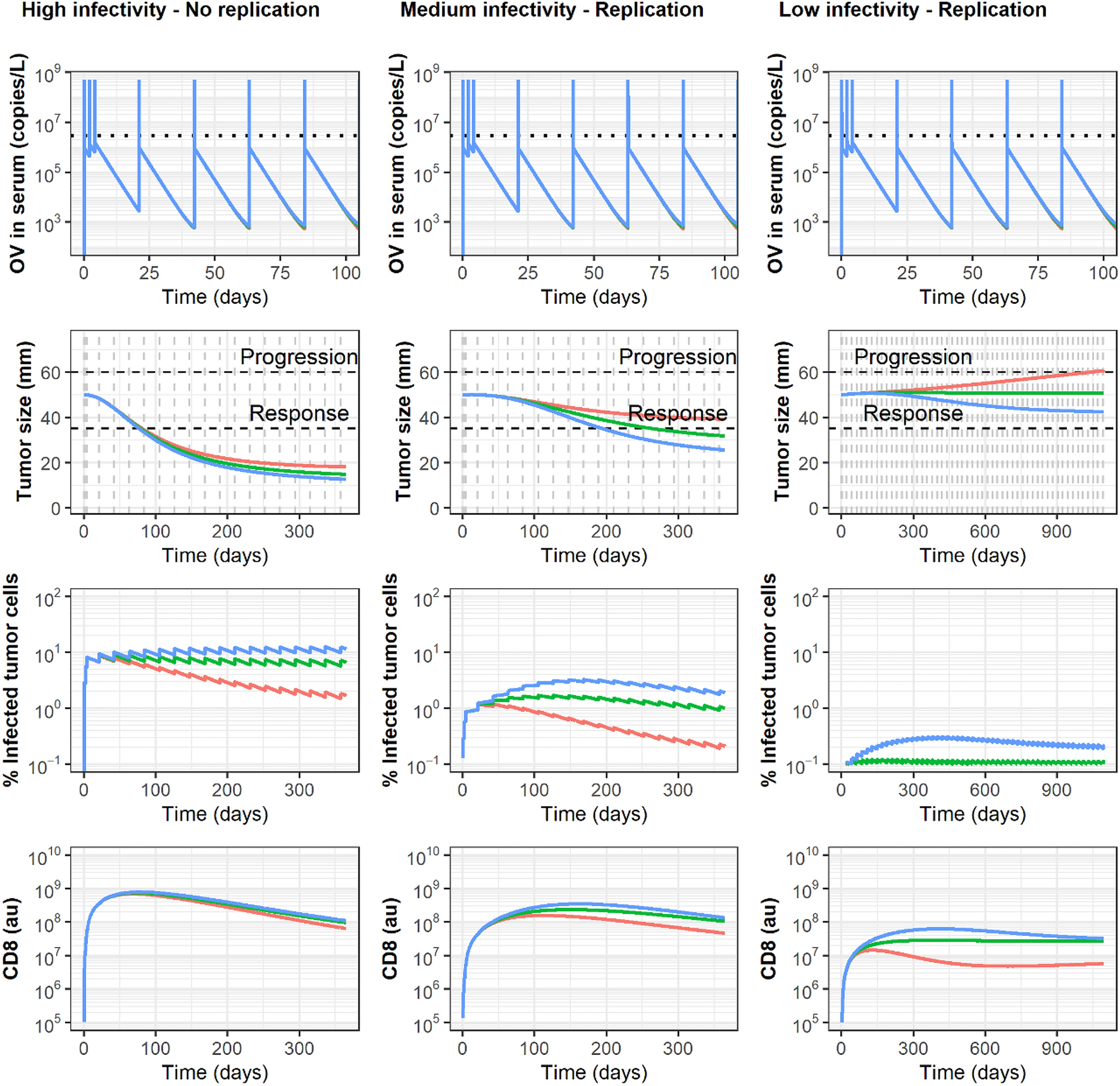 Indeed, when OVs exhibit high infectivity (even in the absence of replication), a similar positive response is obtained after repeated intratumoral administration, regardless of the assumed neutralization level (Fig. 3). According to the model, this is due to the fact that a sufficient CD8 response, summarizing the immune system response, is triggered before neutralization starts playing its role, and thus it is barely affected despite infectivity being reduced. A more meaningful impact on tumor dynamics can be foreseen as infectivity decreases and the role of replication to attain a response increases. In those situations, the lower percentage of infected cells is predicted to translate into a lower CD8 response, thus observing how the appearance of neutralizing antibodies could shift the outcome from responder to stable disease or even non-responder. Interestingly, the different simulation scenarios show only a minor impact on OV serum levels, which appears at concentrations below the limit of detection.