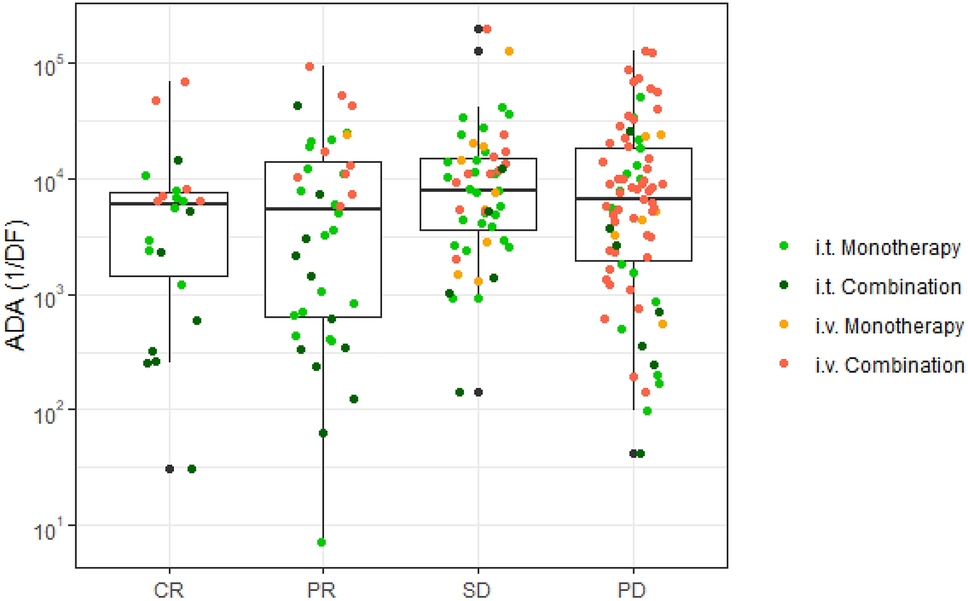 Predicted levels of neutralizing antidrug antibodies (ADAs) by best tumor response according to iRECIST criteria. CR complete response, DF dilution factor, i.v. intravenous, i.t. intratumoral, PD progressive disease, PR partial response, SD stable disease