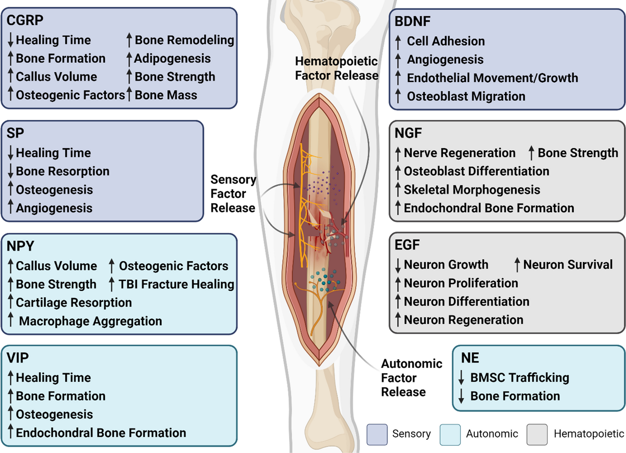 Neurotrophic and neuropeptide impact on fracture healing. This figure summarizes the roles of neurotransmitters and neurotrophic factors in bone repair, illustrating their diverse effects on healing pathways. CGRP, SP, NPY, and VIP are represented on the left, detailing their contributions to reduced healing time and enhanced bone formation and osteogenesis. The central image depicts a bone cross-section with sensory, autonomic, and hematopoietic-derived factor release, signifying the localized effects of these factors. To the right, BDNF, NGF, and EGF are linked with cellular processes essential for bone repair, such as cell adhesion, nerve regeneration, and osteoblast differentiation. The negative influences of NE on bone formation and bone marrow stem cell (BMSC) trafficking are also noted, demonstrating the complex regulatory mechanisms of neurotransmitters in fracture healing. Created with BioRender.com