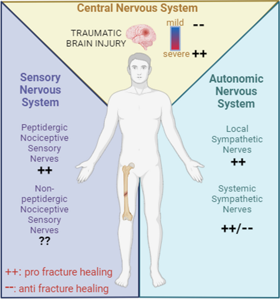 Nervous system regulation of fracture healing. This diagram delineates the influence of different components of the nervous system on fracture healing. The central nervous system (CNS) is represented at the top, with the effects of traumatic brain injury (TBI) on healing shown through varying degrees of impact. The sensory nervous system (SNS) is illustrated on the left with peptidergic or non-peptidergic nociceptive sensory fibers and their effect on fracture healing. The autonomic nervous system (ANS), divided into local sympathetic and systemic nerves, is mapped out on the right, indicating their respective roles in bone repair. Symbols and color gradients provide visual cues to their contributory or detrimental effects, with “ + + ” denoting a positive influence and “—” a negative one on fracture healing. Created with BioRender.com
