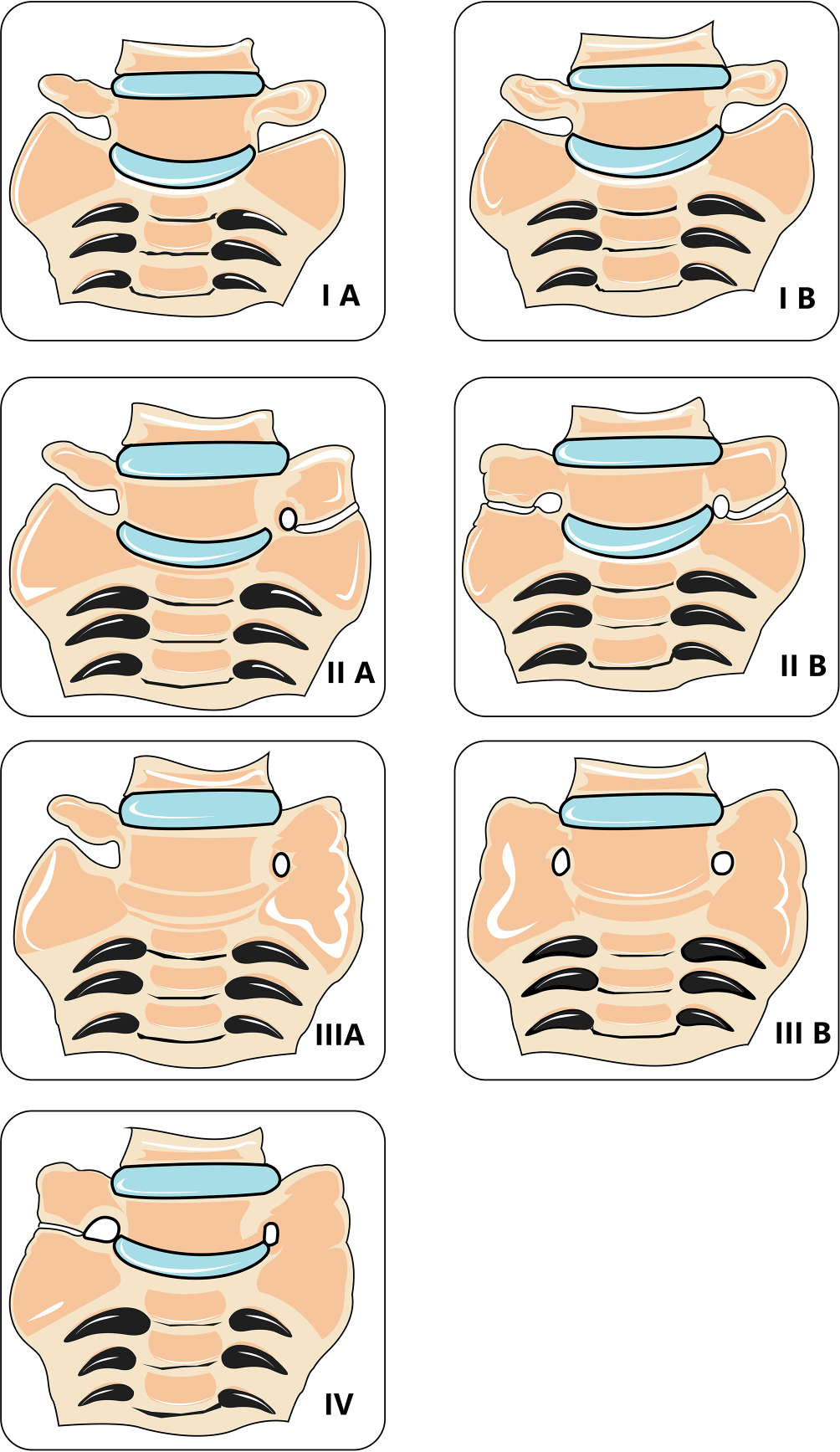 Nach Castellvi et al. wird das Bertolotti-Syndrom in 4 Subtypen unterschieden (Abb. 1). Typ 1 weist einen vergrößerten, triangulären Processus transversus (kraniokaudale Ausdehnung des Querfortsatzes ≥19 mm) auf. Typ 2 zeigt ein Neogelenk zwischen dem Processus transversus des L5 und der Ala ossis sacri. Zusätzlich wird zwischen Typ A (unilateraler Befund) und Typ B (bilateraler Befund) unterschieden. Bei Typ 3 liegt eine Verknöcherung vor, d. h. es besteht kein Neogelenkspalt mehr, stattdessen findet sich eine solide Fusionsmasse. Ergänzend gibt es bei Typ 4 noch eine Mischung der Befunde aus Typ 2 einerseits und Typ 3 andererseits [15].