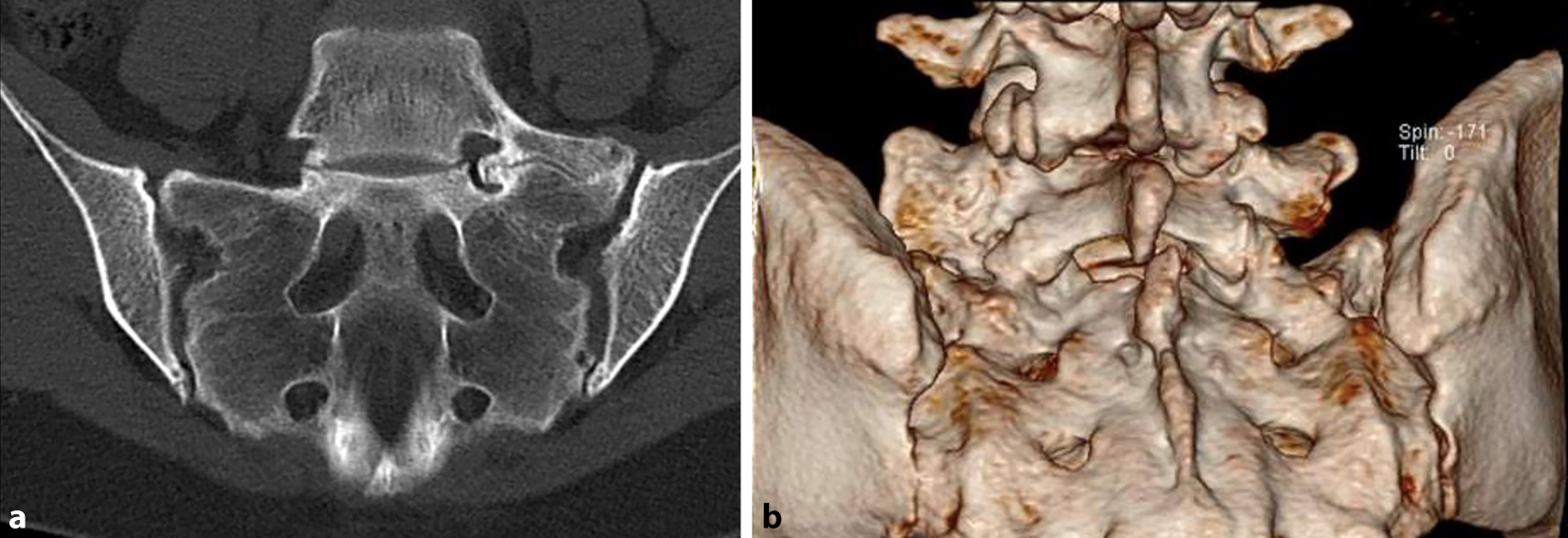 CT-Darstellung (a) einer lumbosakralen Übergangsanomalie Typ Castellvi IIA mit 3‑D-Rekonstruktion (b)