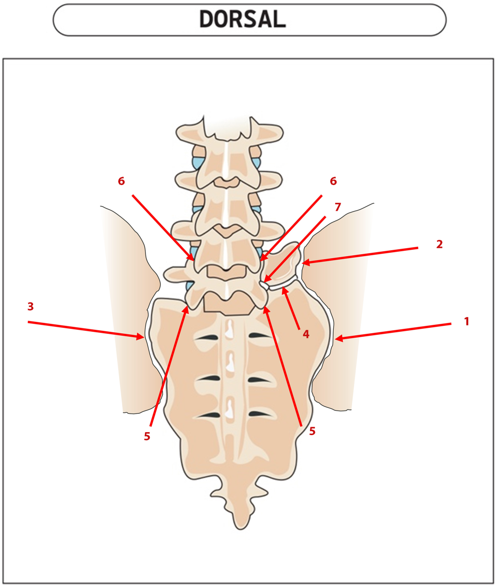 Infiltrationsmöglichkeiten. 1 Iliosakralgelenk (ISG) kaudal des Neoarthros, 2 ISG kranial des Neoarthros, 3 ISG der Gegenseite, 4 horizontaler Neoarthros, 5 Facettengelenk L5/S1 ipsi- und kontralateral, 6 Facettengelenke L4/5 und 7 Nervenwurzel L5 intraforaminal L5/S1