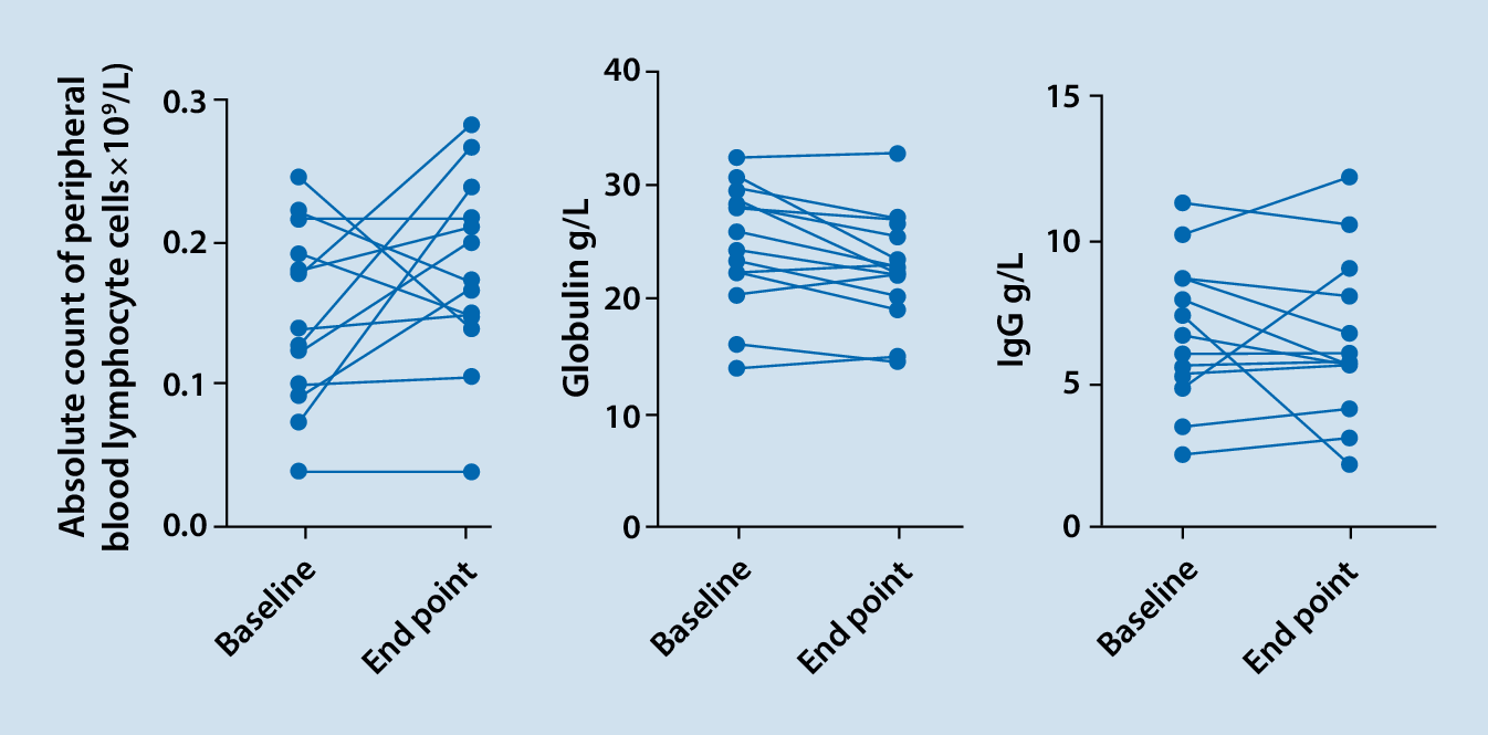 Twelve of the remaining 14 cases achieved a reduction in glucocorticoid administration by > 25% or a maintenance dose of ≤ 7.5 mg daily, of which 4 cases maintained a prednisolone dose ≤ 7.5 mg/d, and no cases increased glucocorticoid dosage. Fourteen cases had both C3 and C4 reexamined, and all cases showed either a stable or upwards trend; among them, all cases (100%) had hypocomplementemia at baseline, and 7 cases (50%) reported normal C3 and C4 levels at the end of follow-up. At the observation endpoint, the median 24‑h urinary protein value of the 13 cases with proteinuria (baseline 24‑h urinary protein > 0.5 g/d) showed a reduction, and 3 of them became negative. Among the 14 cases with hypoalbuminemia, plasma albumin increased to normal levels in four cases, and one case was not reexamined. Seven cases were subjected to reexamination of the anti-dsDNA antibody titer at the endpoint, and the antibody had become negative in 3 of these cases (Table 3). Between baseline and the endpoint, serum total immunoglobulin decreased in 9 patients, serum IgG decreased in 4 patients, and peripheral blood lymphocytes decreased in 6 patients, among whom 2 patients had a serum IgG level < 4.5 g/L, and there was no statistical difference in the above indicators (p = 0.403, p = 0.148, p = 0.285; Fig. 1). No serious infection was reported. Case 1 was a refractory patient with lupus hepatitis confirmed by liver pathology. Belimumab combined with the standard treatment was ineffective for 6 months, but after changing to telitacicept treatment, the liver function returned to normal.