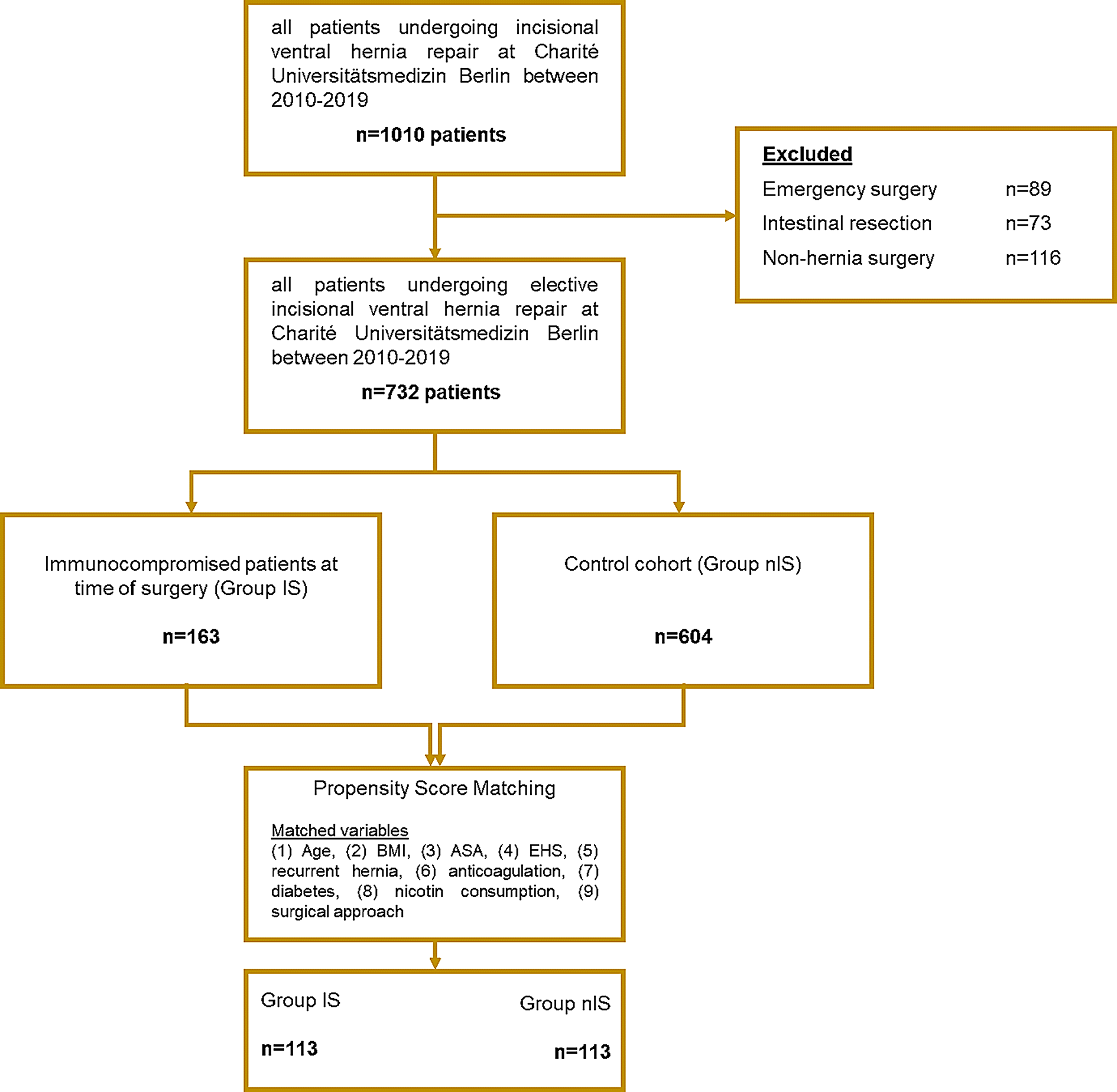 All patients undergoing ventral hernia repair for incisional herniae between January 2010 and December 2019 at Surgical Department of the Charité – Universitätsmedizin Berlin were included in the analysis. Immunosuppressed patients were defined by (i) taking immunosuppressive drugs with systemic effect or (ii) by the definition of their disease (e.g. Human immunodeficiency virus, HIV). Patients undergoing topical steroid therapy without systemic effects were not classified as immunosuppressed. Patients with oncological disease were only considered immunosuppressed if systemic therapy was administered within four weeks prior to surgery.
